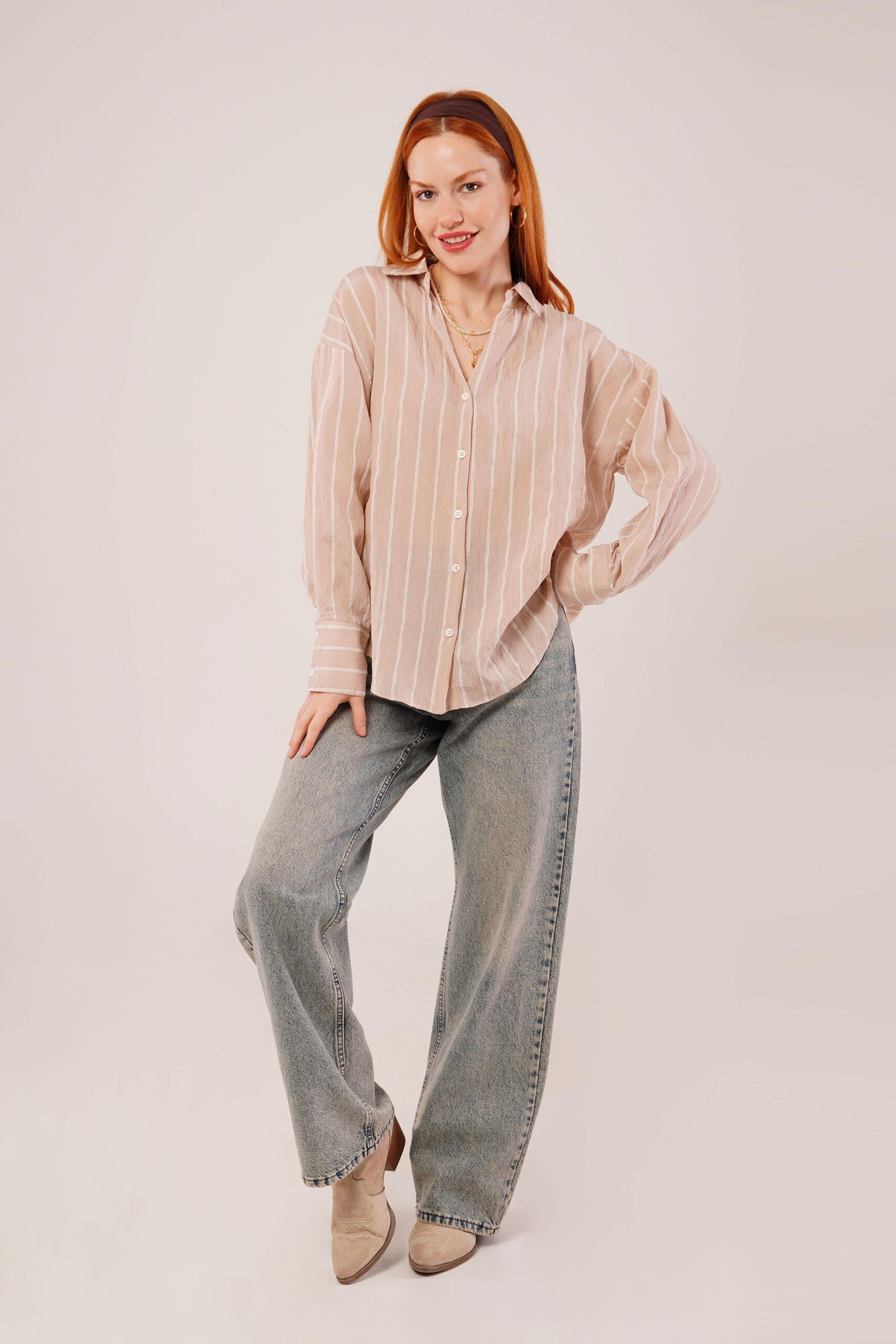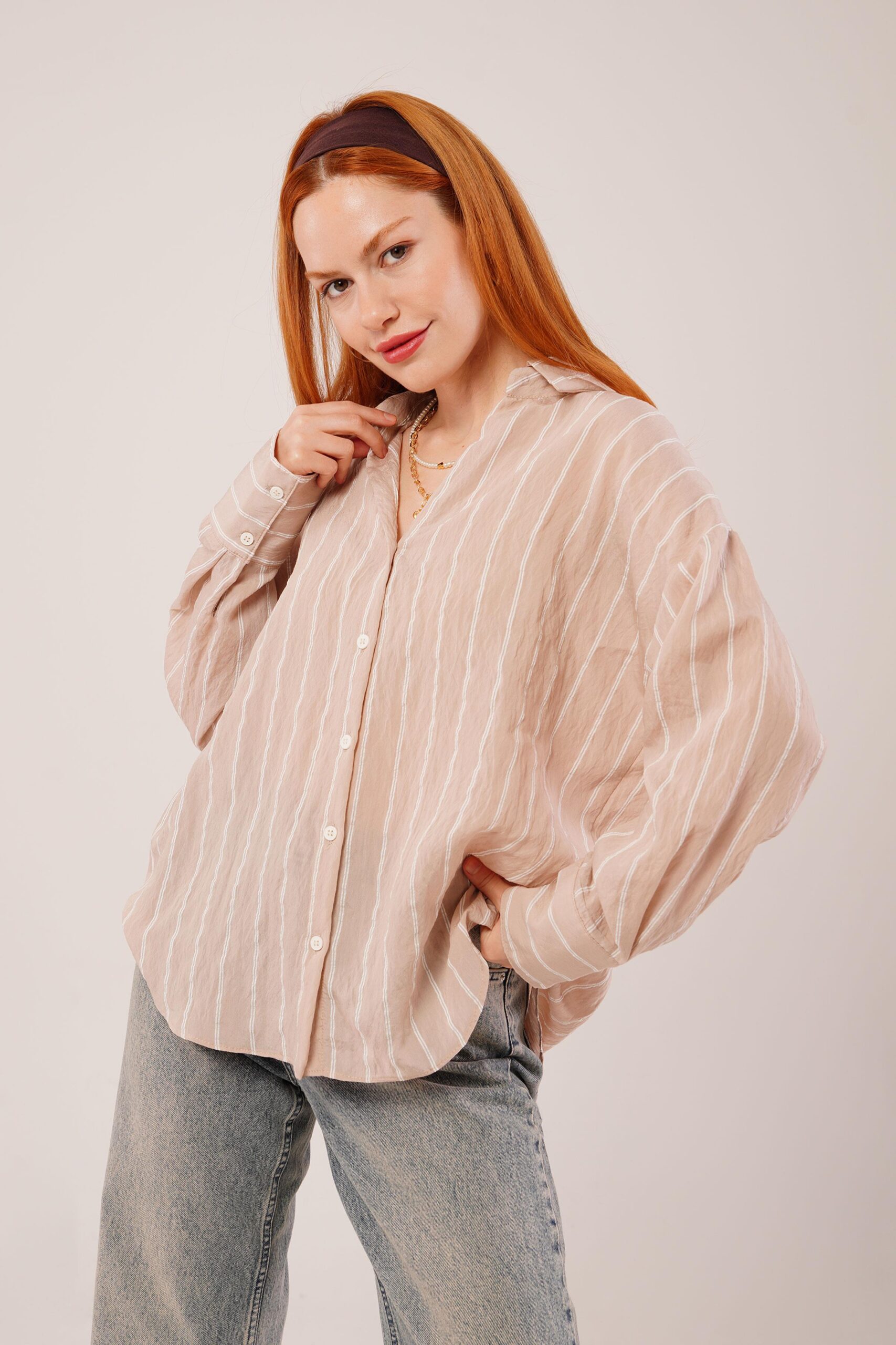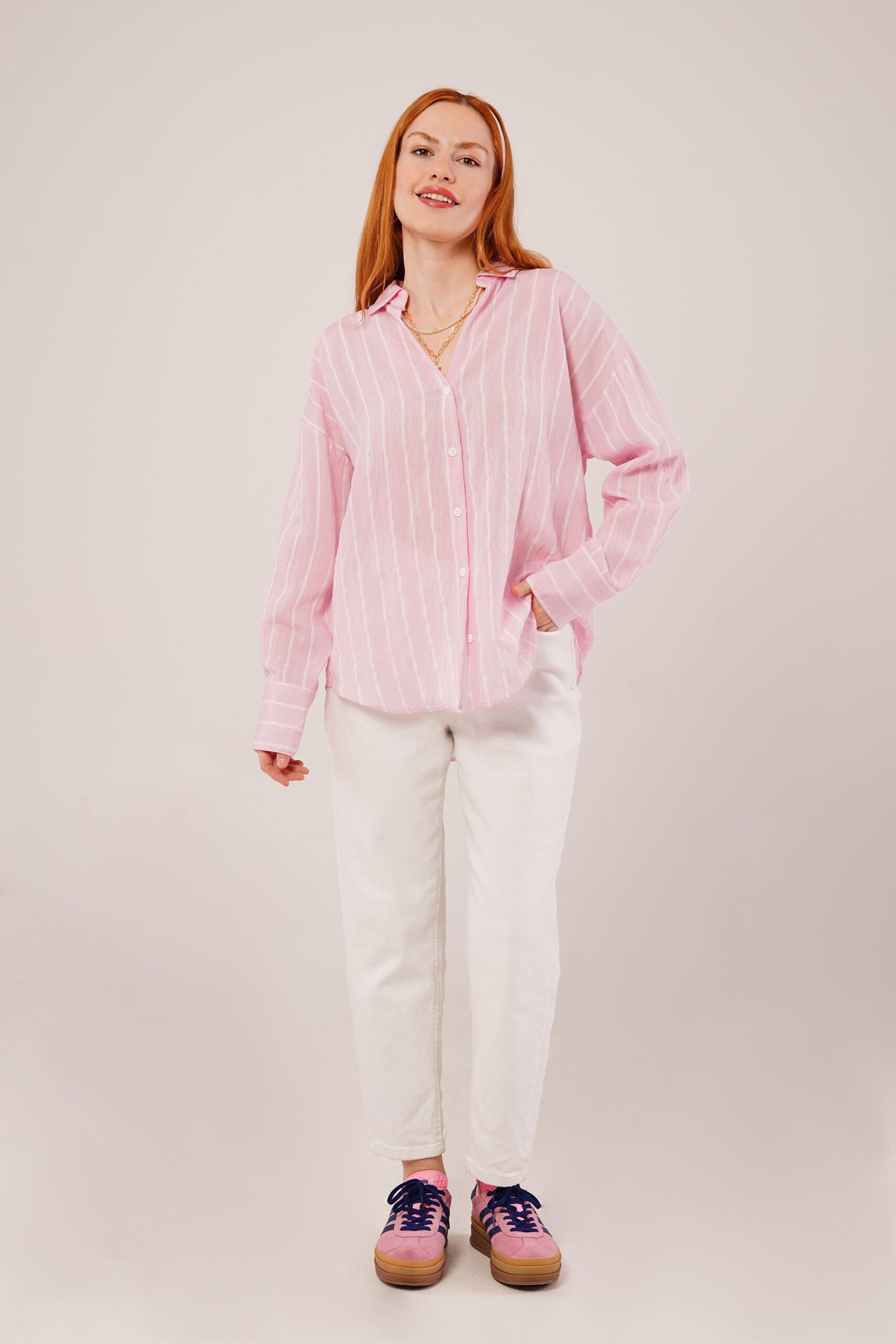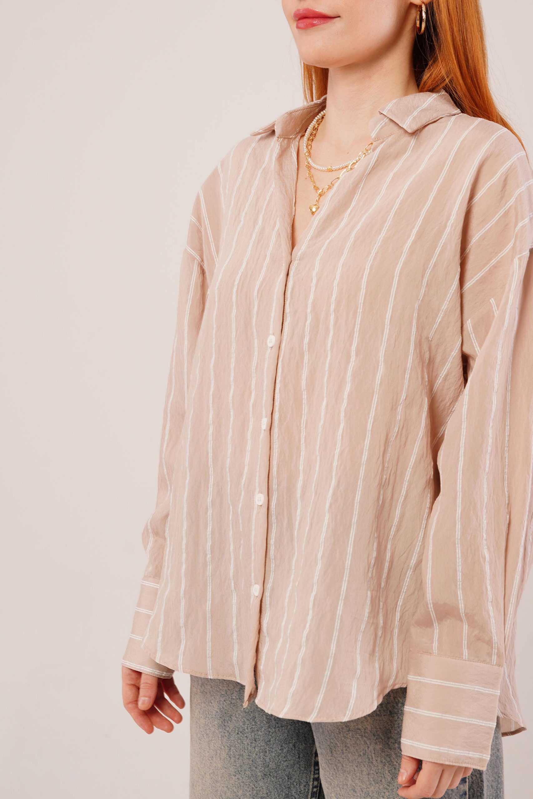 Kol Düğmeli Çizgili Pembe Gömlek