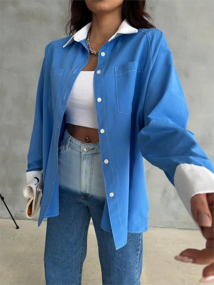 KOL VE MANŞET BEYAZ KAPALI PİLE DETAYLI GÖMLEK – Mavi