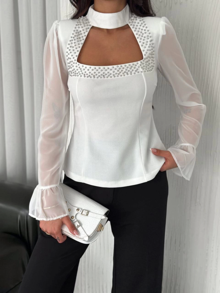 Kolları Şifon Göğüste İnci Boncuk Detaylı Bluz – Beyaz