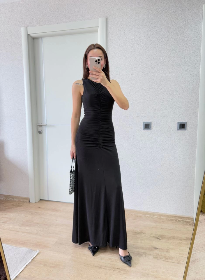 “Kolsuz Büzgülü Uzun Elbise – Siyah” için yorum yapan ilk kişi siz olun
