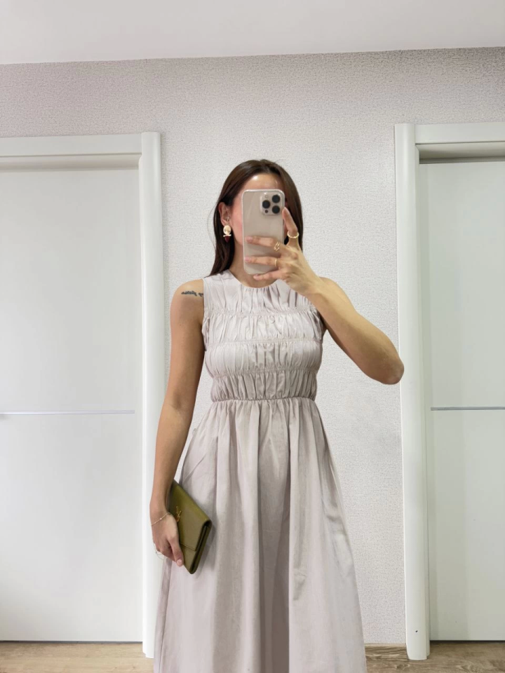 Kolsuz Göğüs Lastıklı Uzun Elbise – Gri