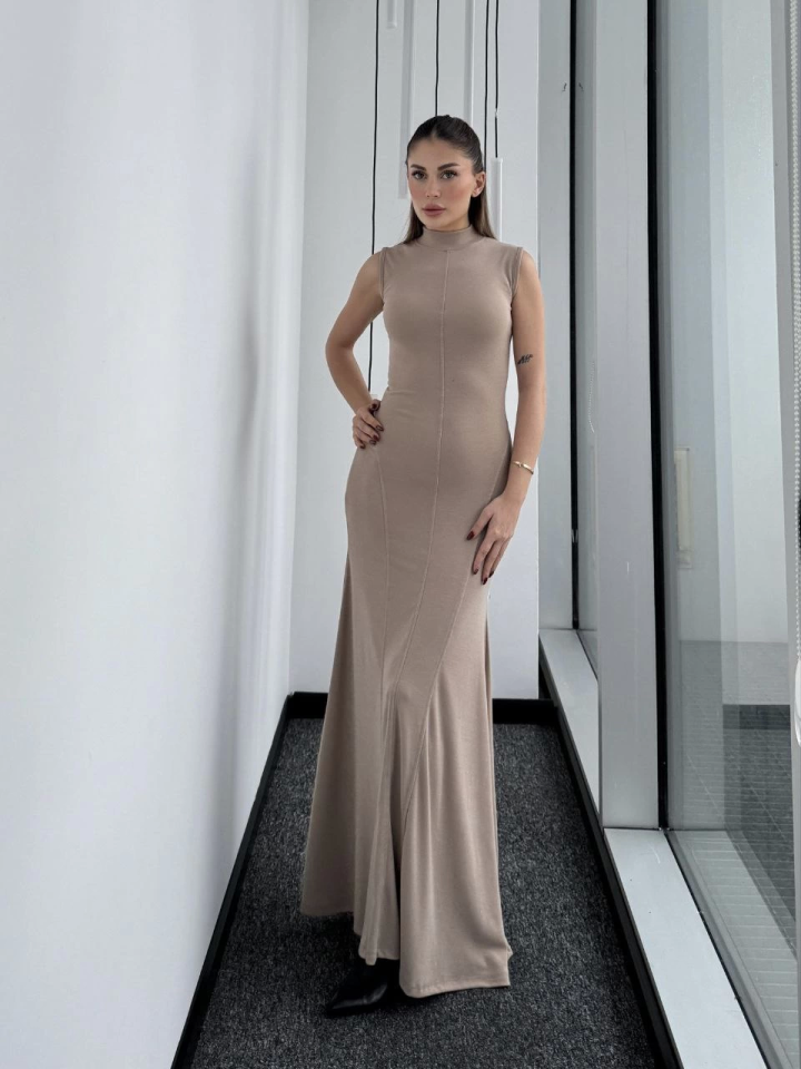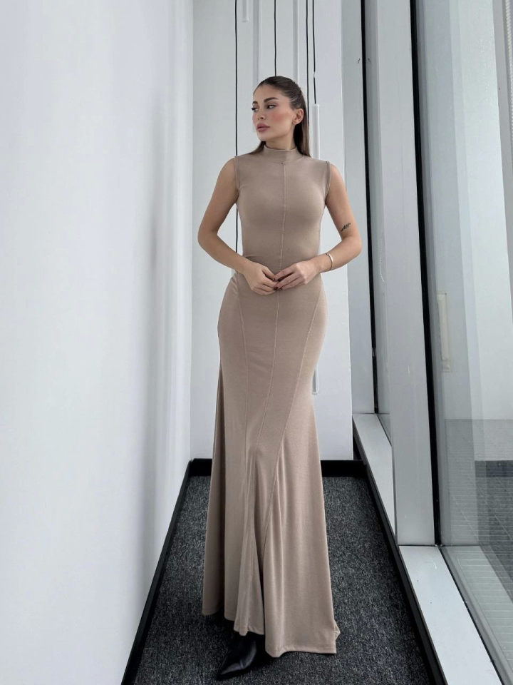 Kolsuz Yarım Bogazlı Uzun Elbise- Bej