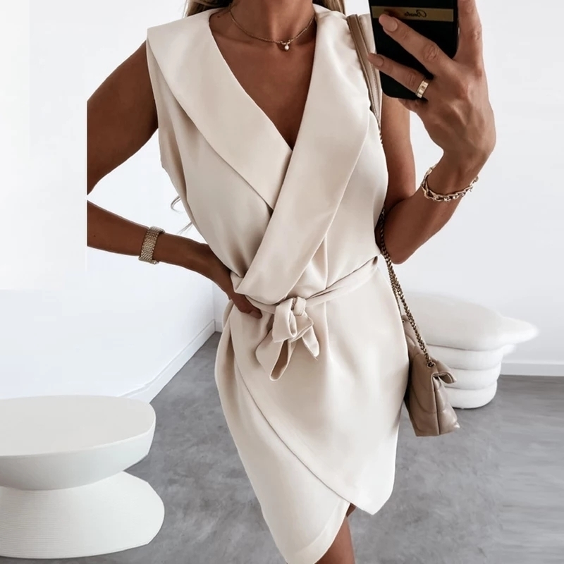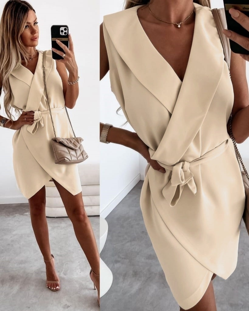 Kruvaze Yaka Kuşaklı Krep Kumaş Elbise
