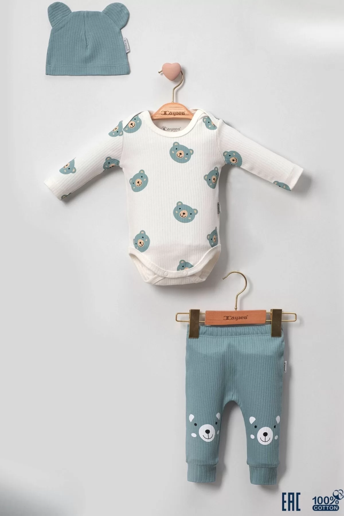 Kulaklı Ayıcık % 100 Pamuk 3’lü Erkek Bebek Takım.