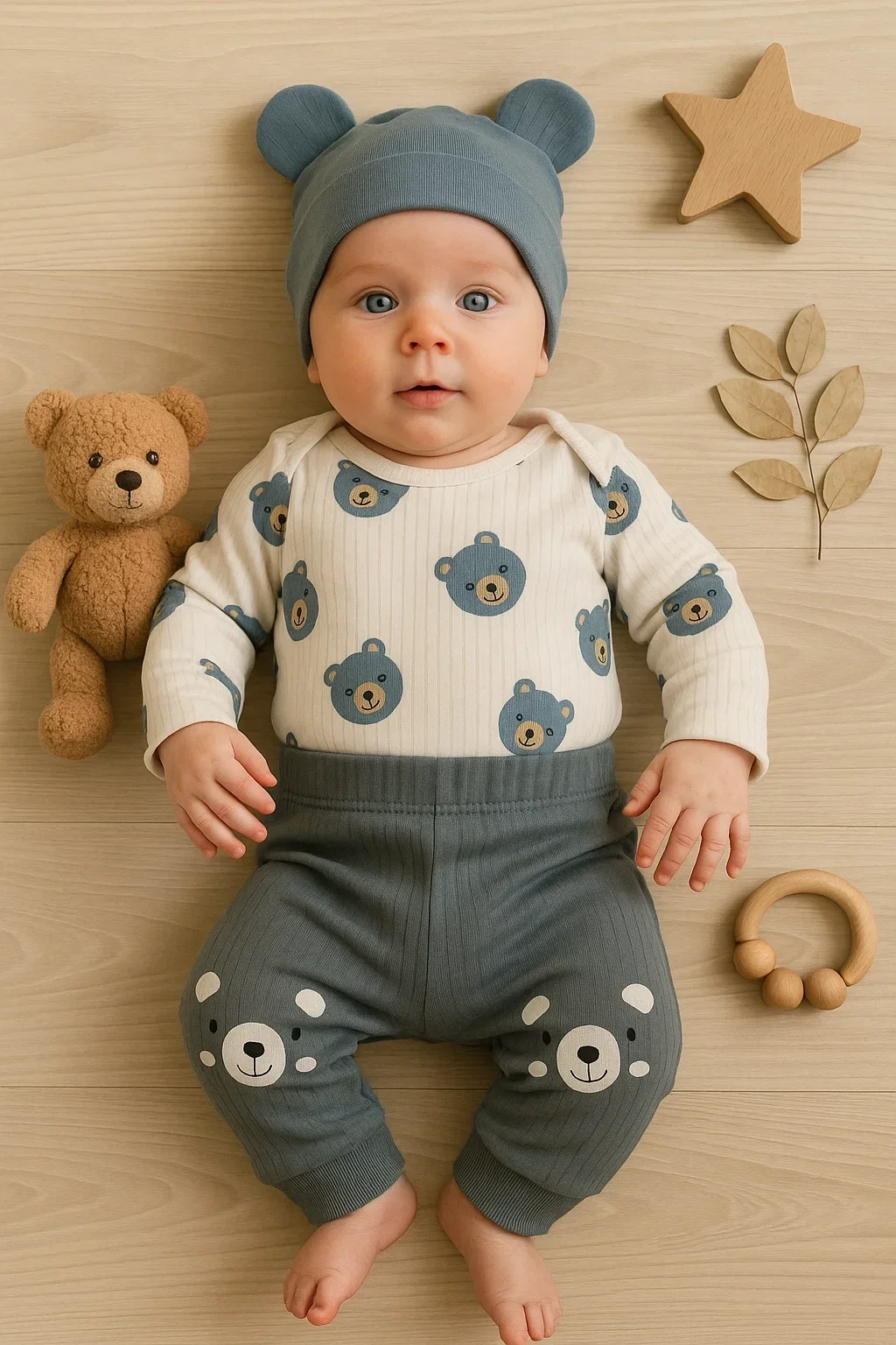 Kulaklı Ayıcık % 100 Pamuk 3’lü Erkek Bebek Takım