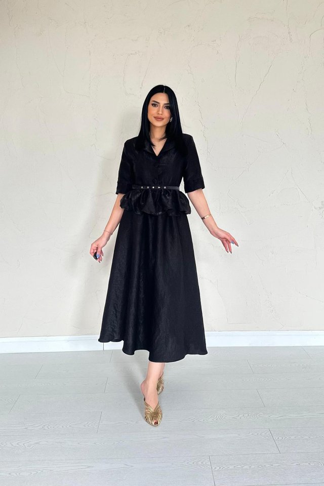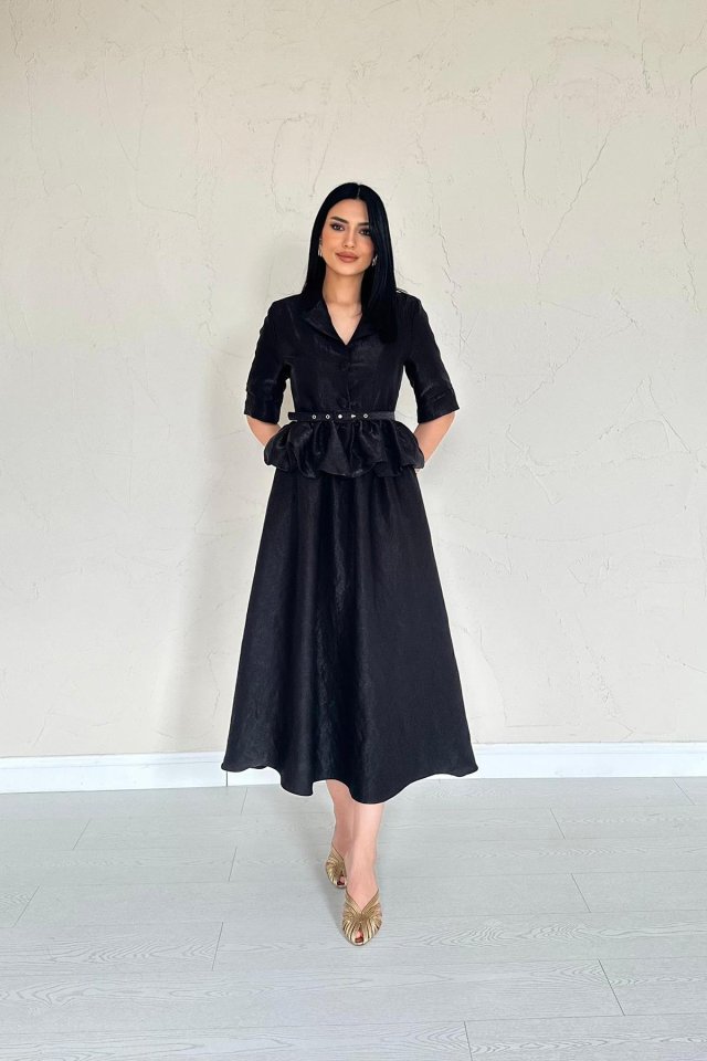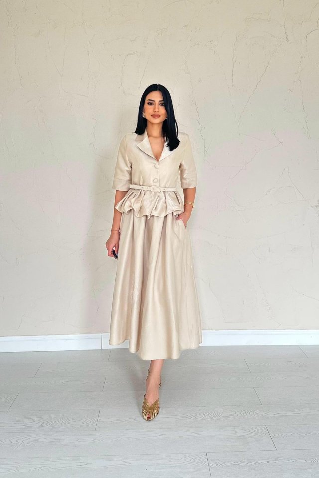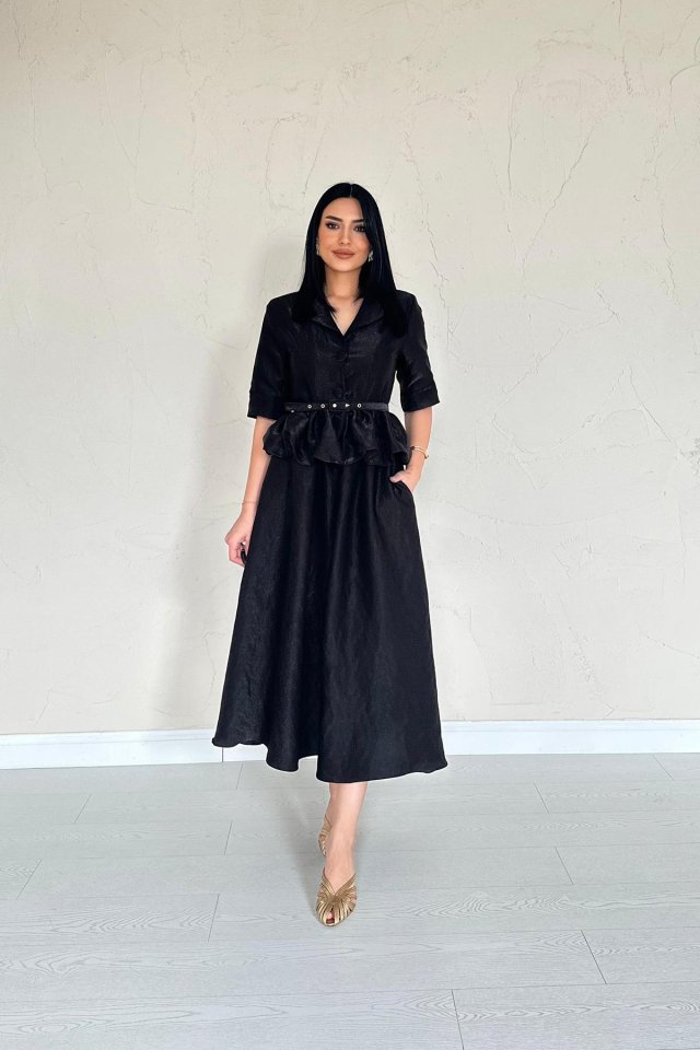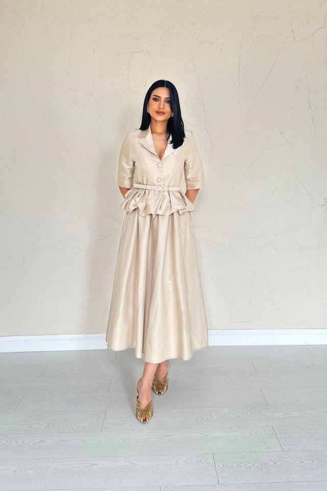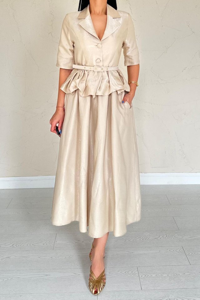 Lacivert İnce Kemerli Fırfırlı Ceket Ve Büzgülü Etek Takım