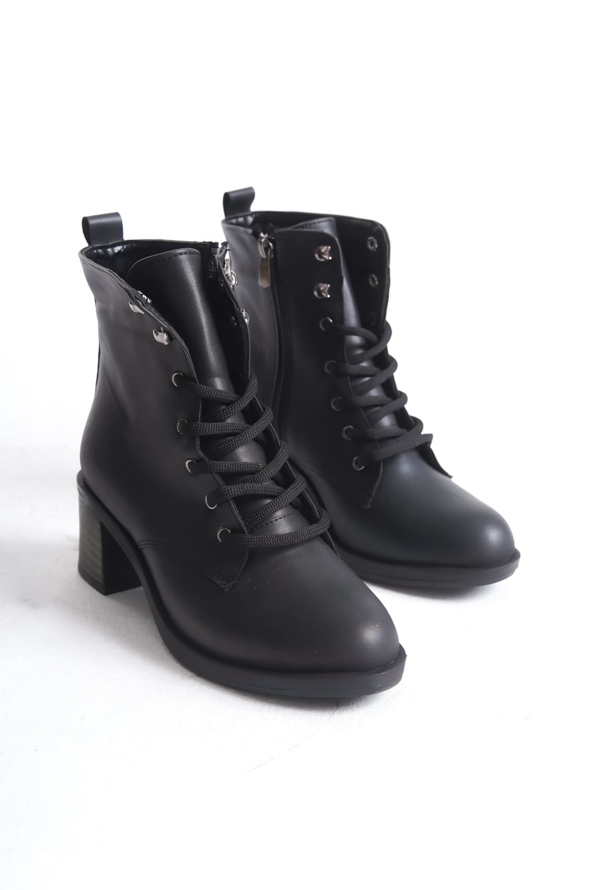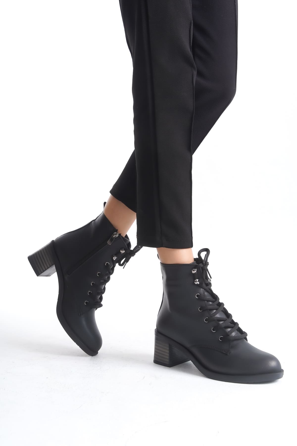 LENA Bağcıklı Fermuarlı Ortopedik Taban Topuklu Kadın Bot CST – Siyah