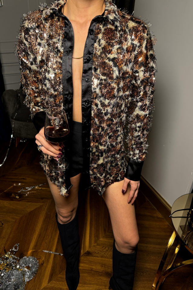 LEOPAR SAÇAKLI PAYETLİ GÖMLEK MANŞET SATEN DETAYLI – Bakır