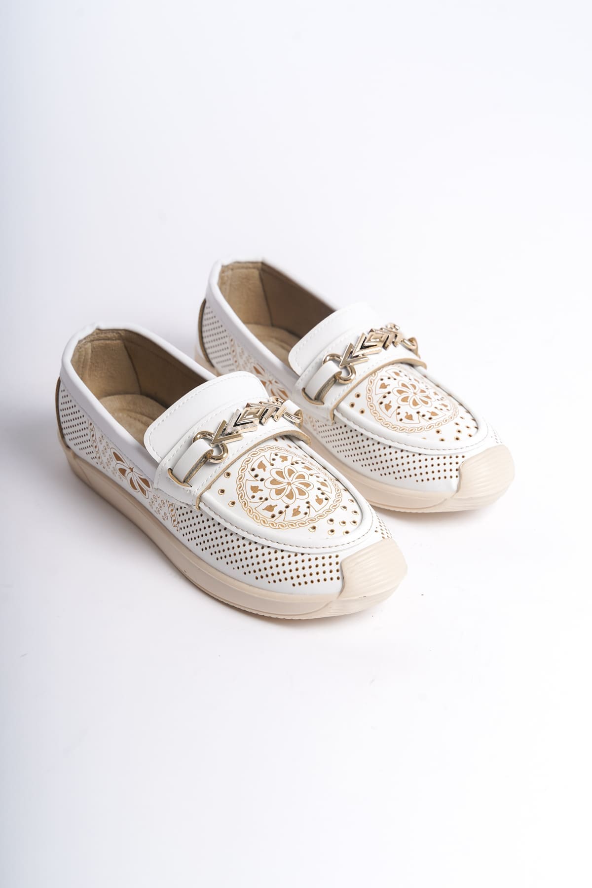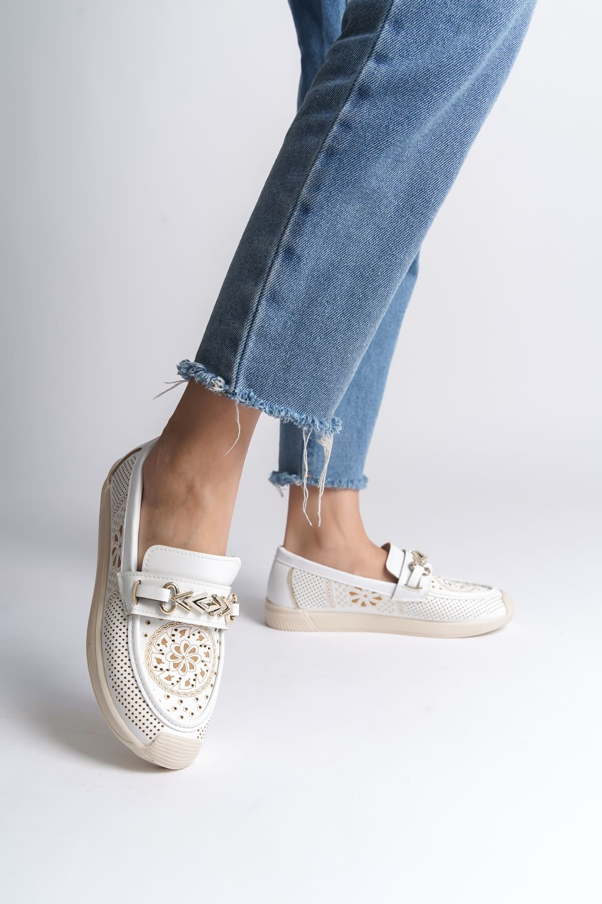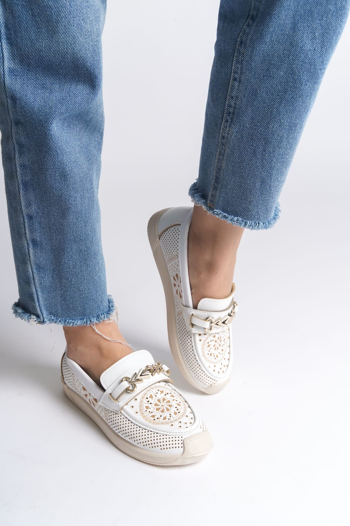 LILY Bağcıksız Ortopedik Rahat Taban Çiçek Desenli Kadın Babet Ayakkabı CKT – Beyaz