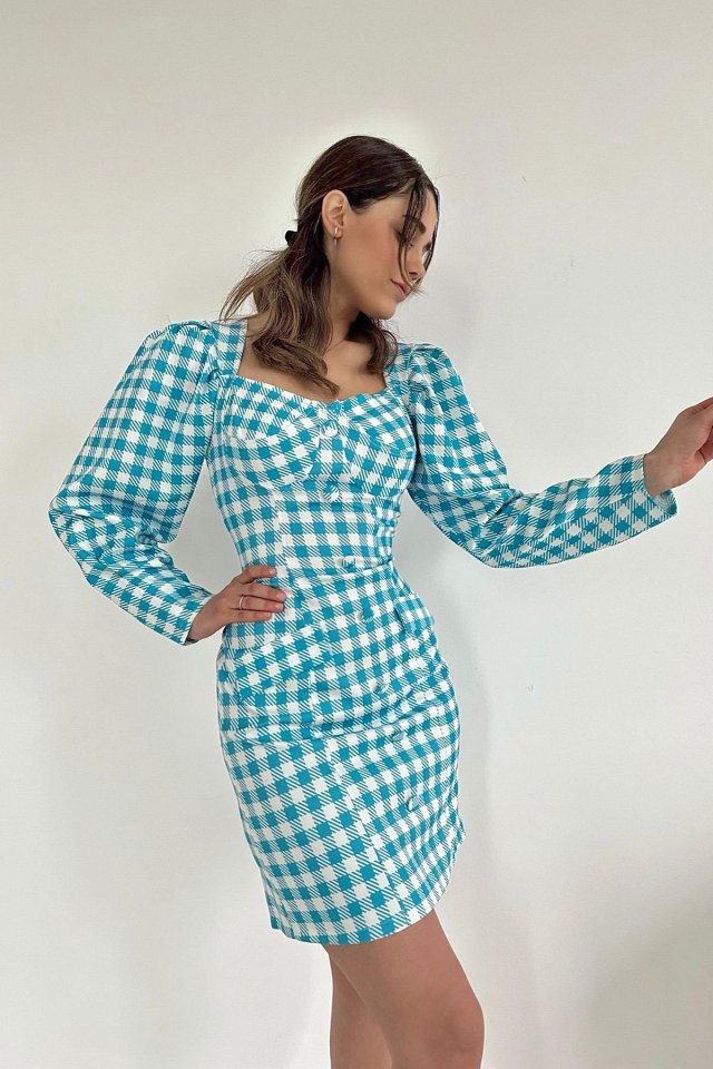 Mavi Kareli Göğüş Kuplu Elbise
