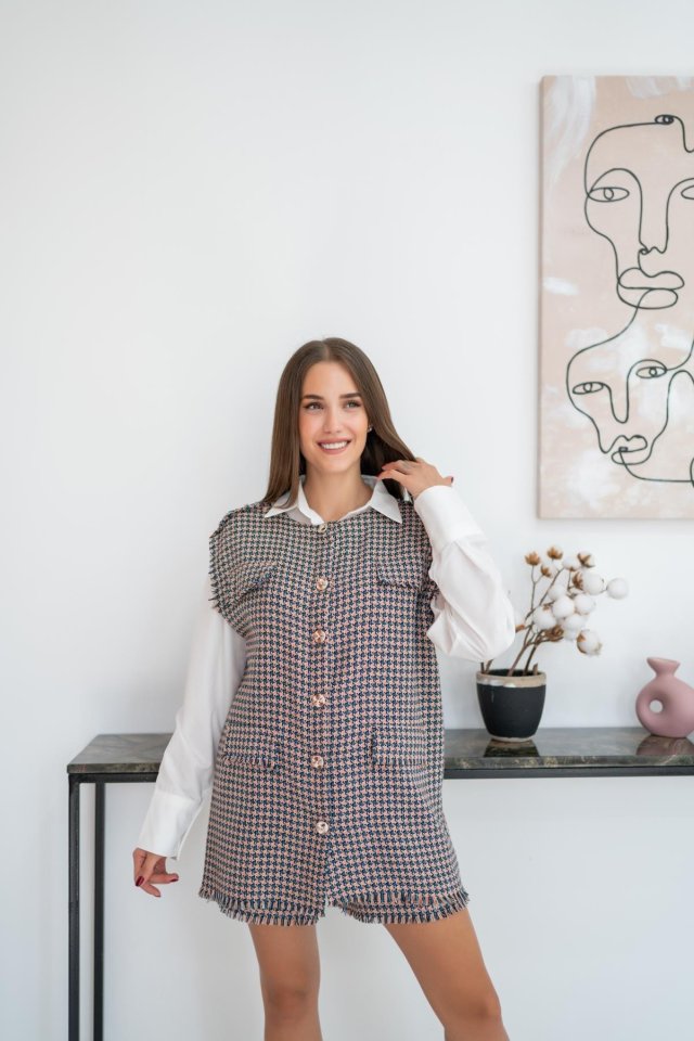 Kahverengi Kazayağı Desenli Yelek Ve Şort Takım