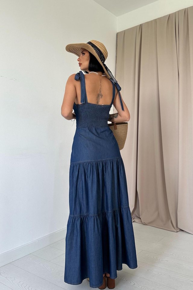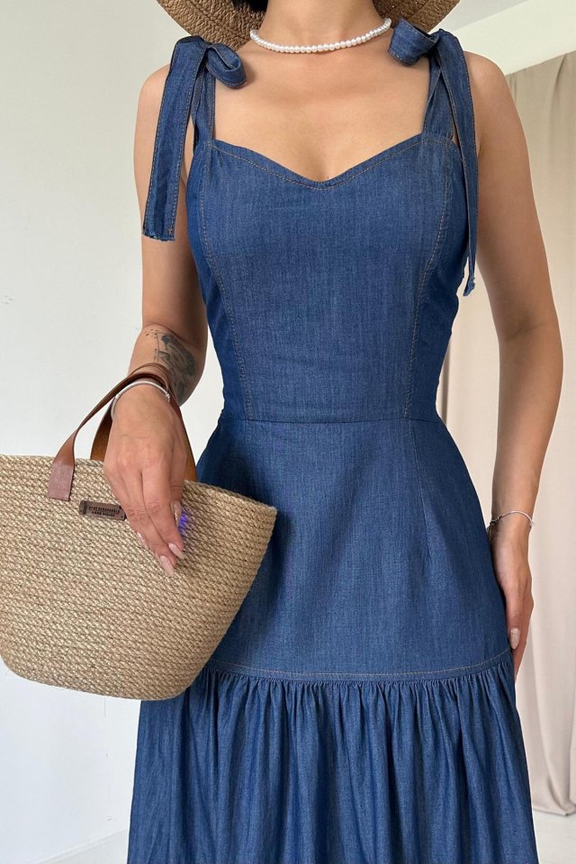 Mavi Tencel Bağlamalı Askılı Elbise