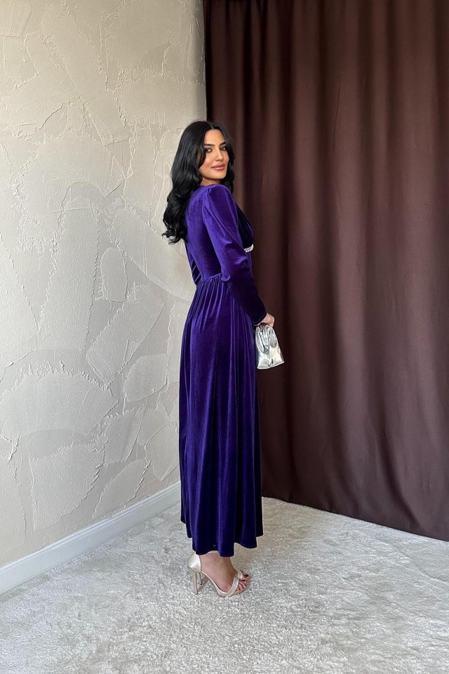 Mor Göğüs Altı Taşlı Elbise