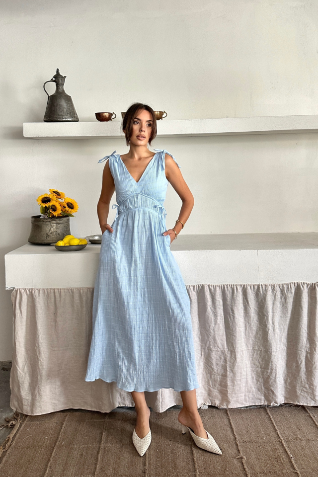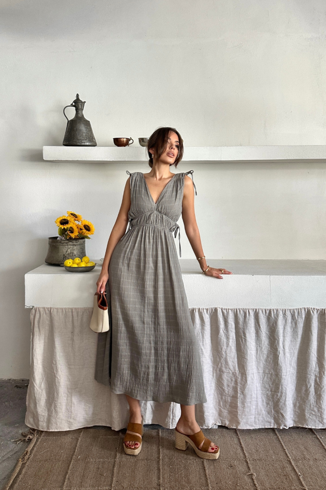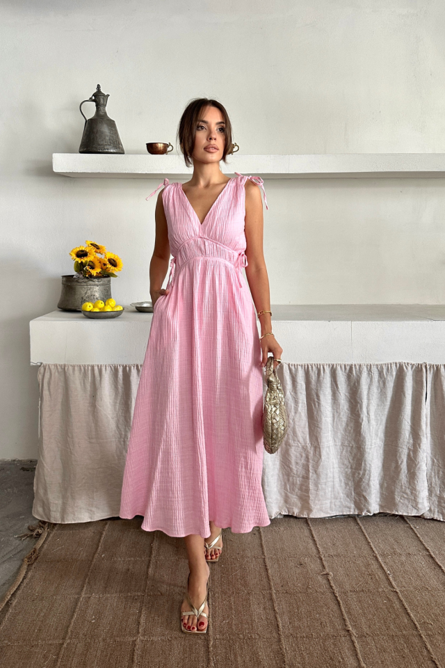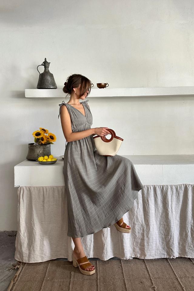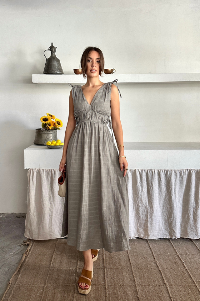 MÜSLİN ELBİSE OMUZ BÜZGÜ DETAYLI V YAKA KOLSUZ ELBİSE – Kahverengi