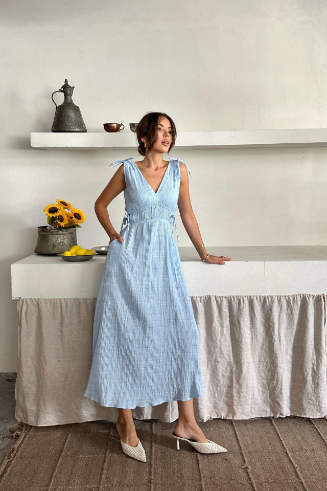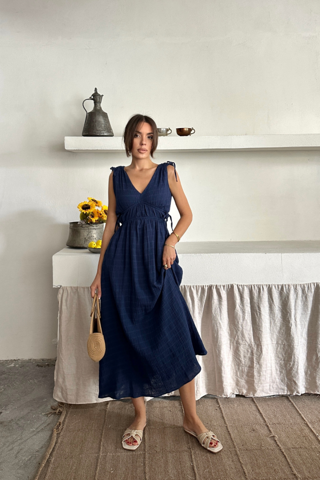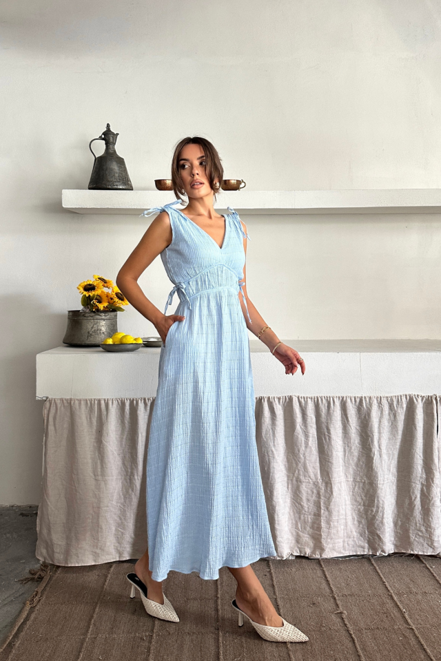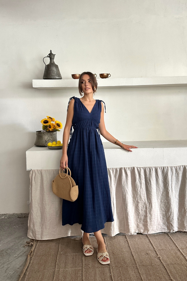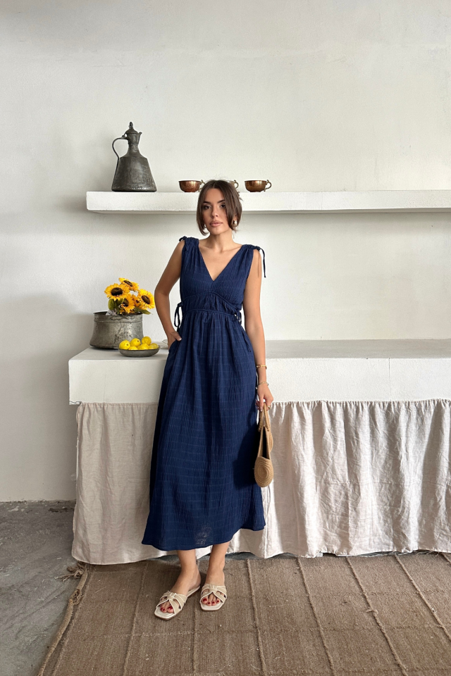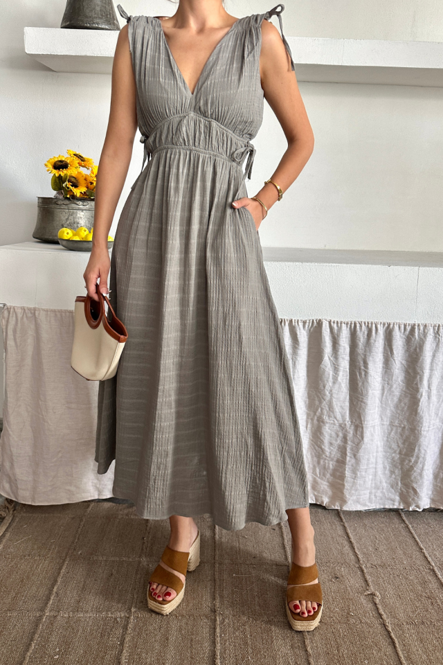 MÜSLİN ELBİSE OMUZ BÜZGÜ DETAYLI V YAKA KOLSUZ ELBİSE – Kahverengi