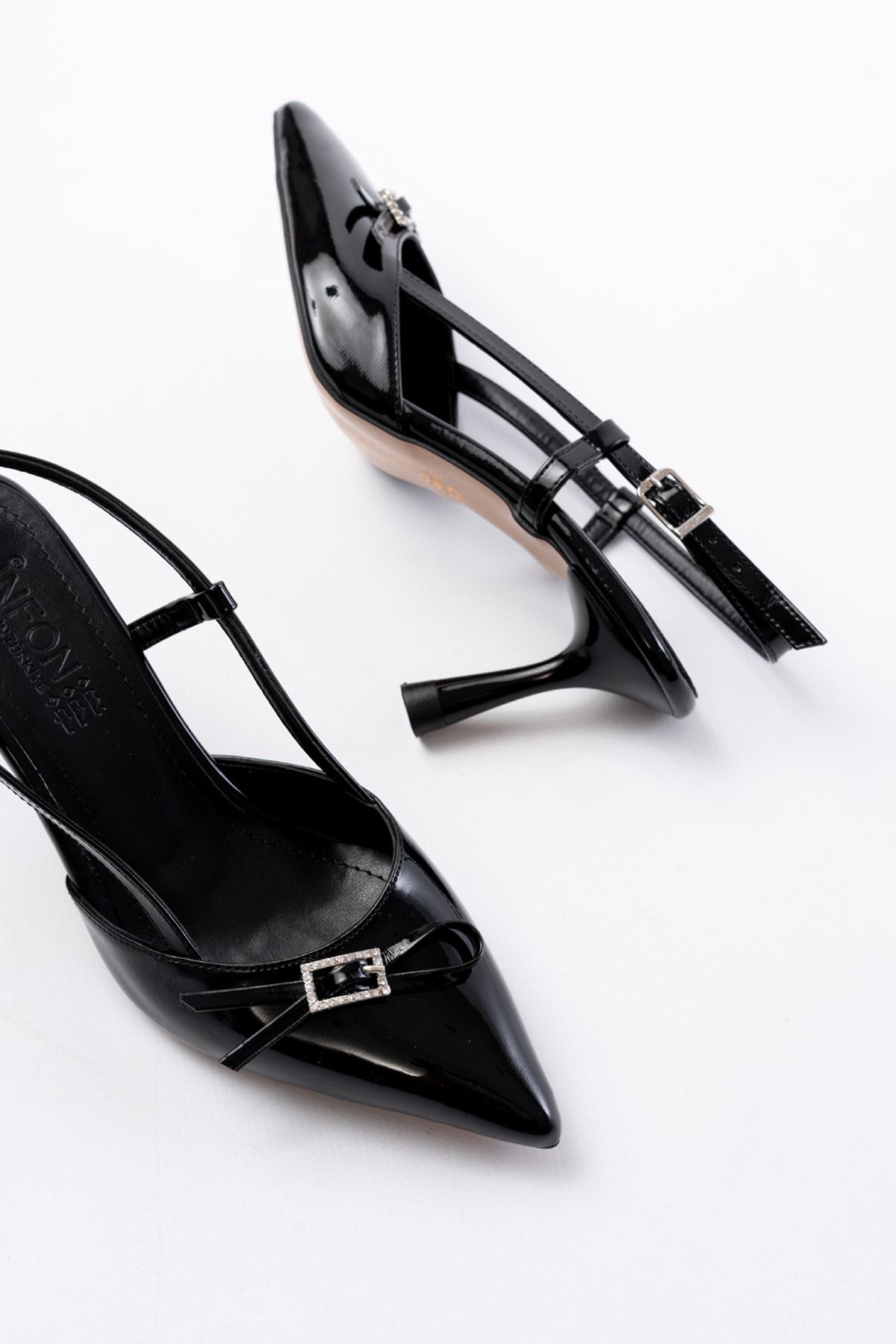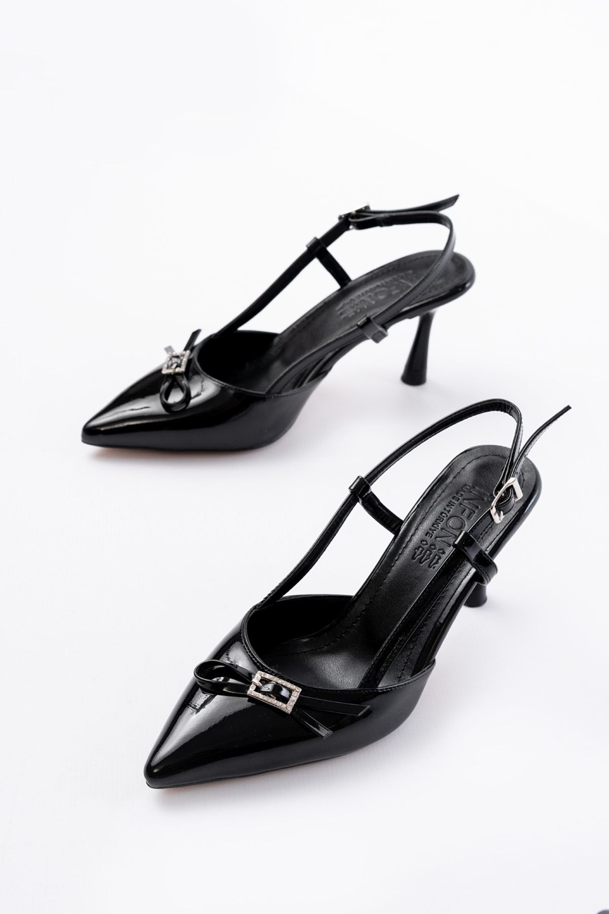 İNF-2300 Siyah Rugan Günlük Arkası Açık Fiyonklu Topuklu Bayan Ayakkabı