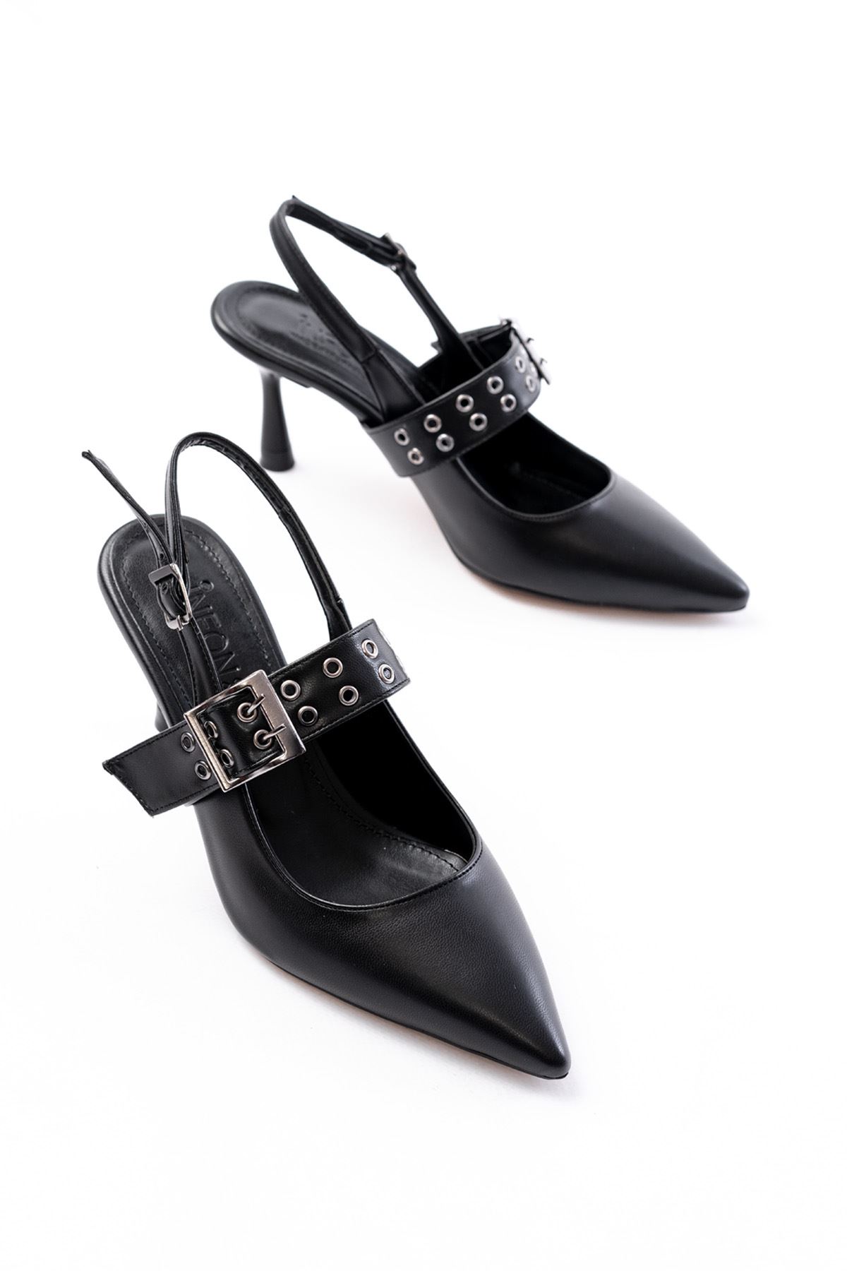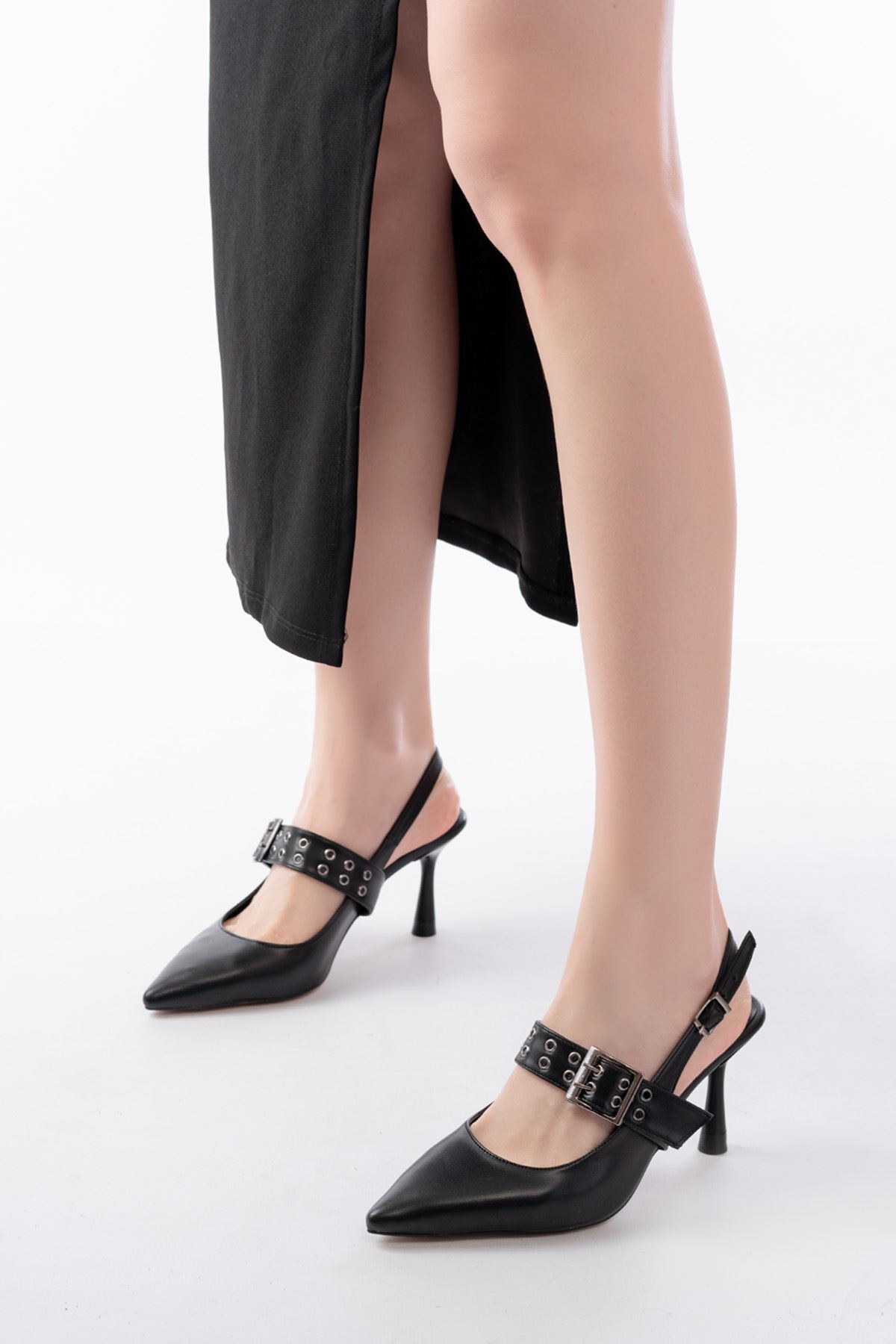 İNF-260 Siyah Günlük Arkası Açık Baret Tokalı Topuklu Bayan Ayakkabı
