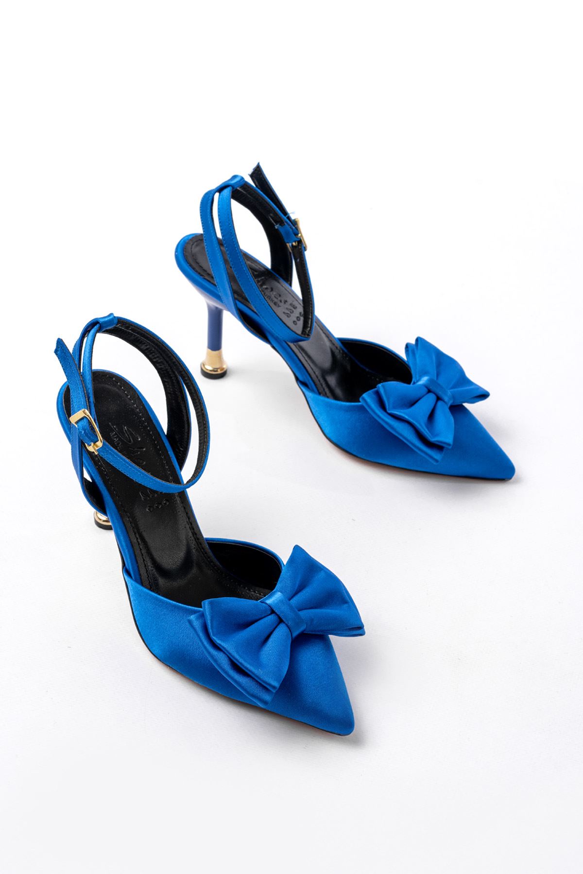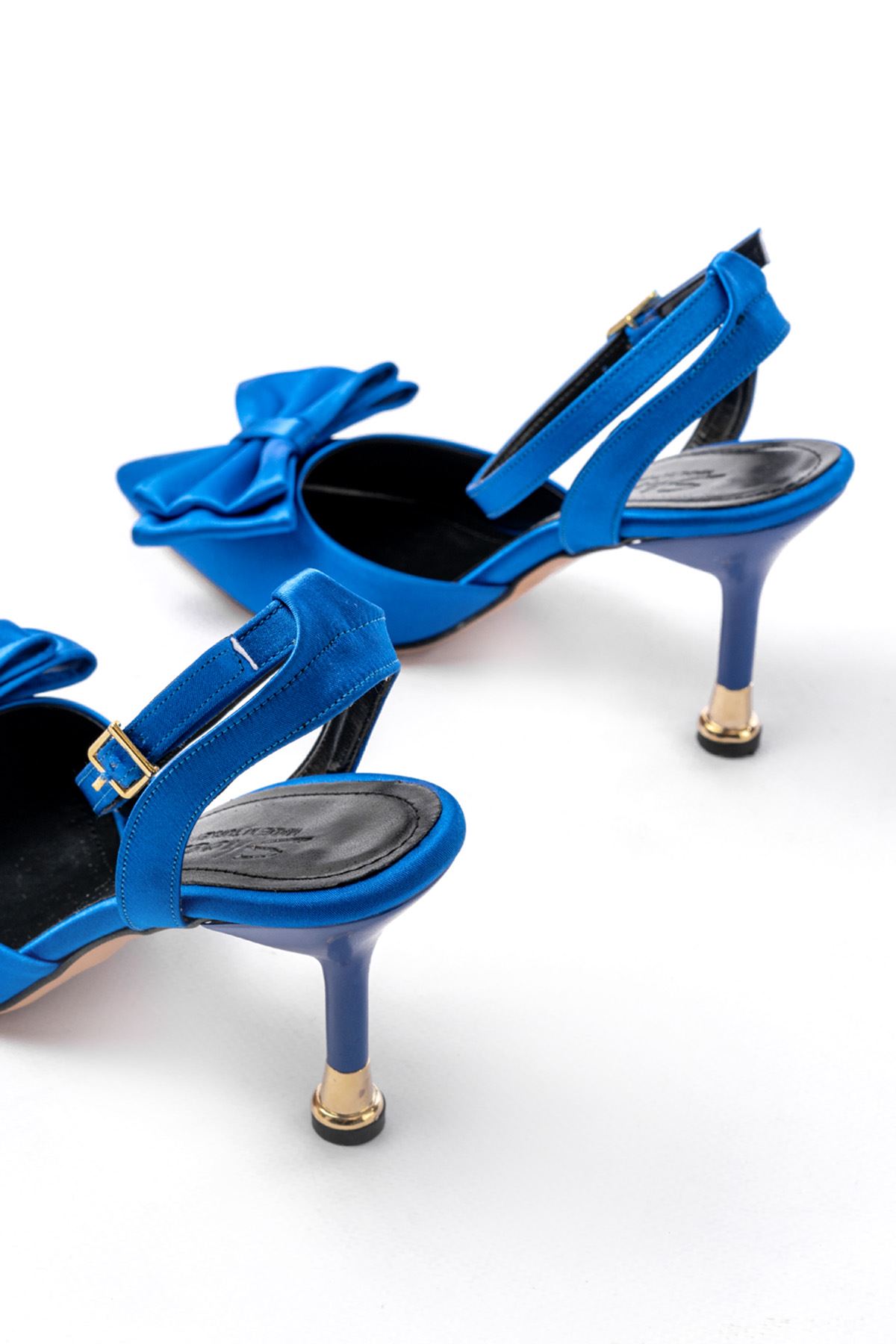 İNF-4505 Mavi Saten Günlük Arkası Açık Kurdele detaylı Topuklu Bayan Ayakkabı