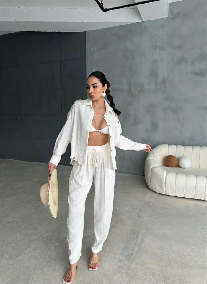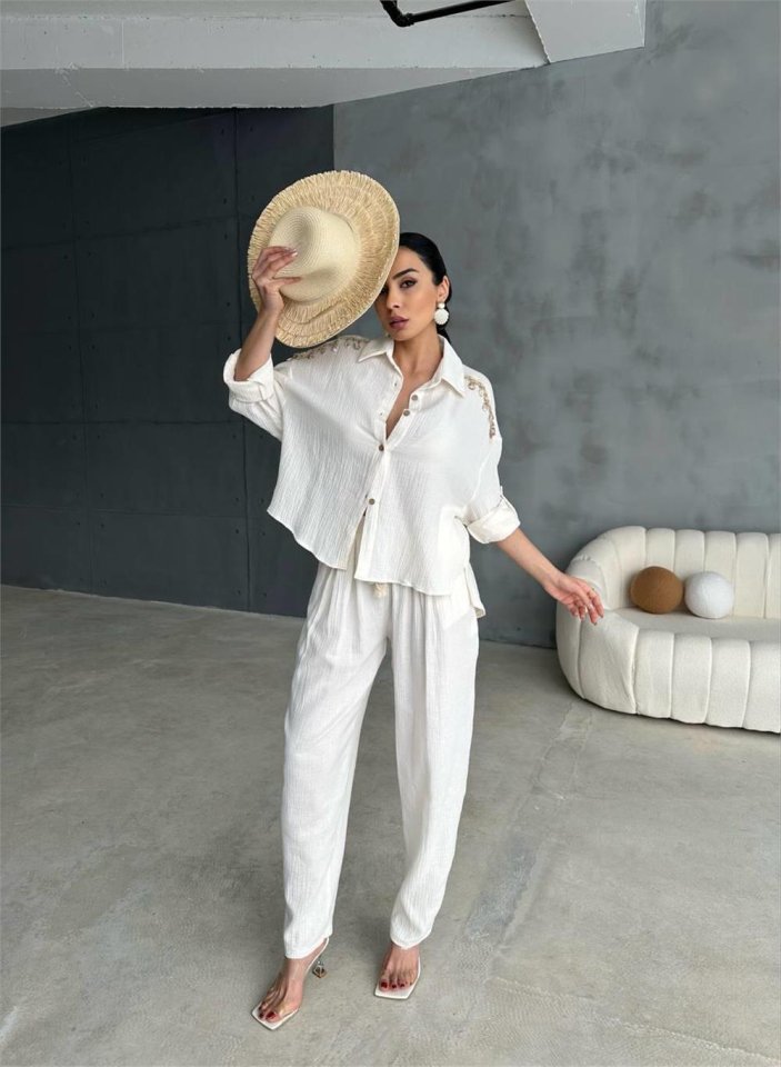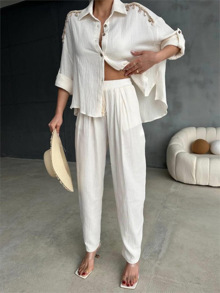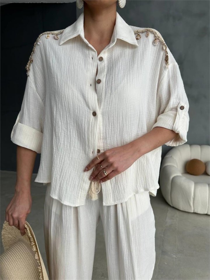 OMUZ SAÇAK DENİZ KABUĞU GÖMLEK – PANTOLON TAKIM – Ekru
