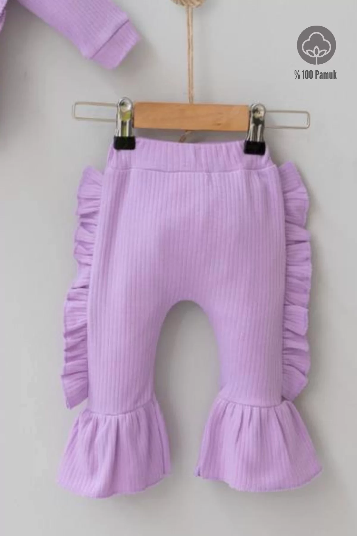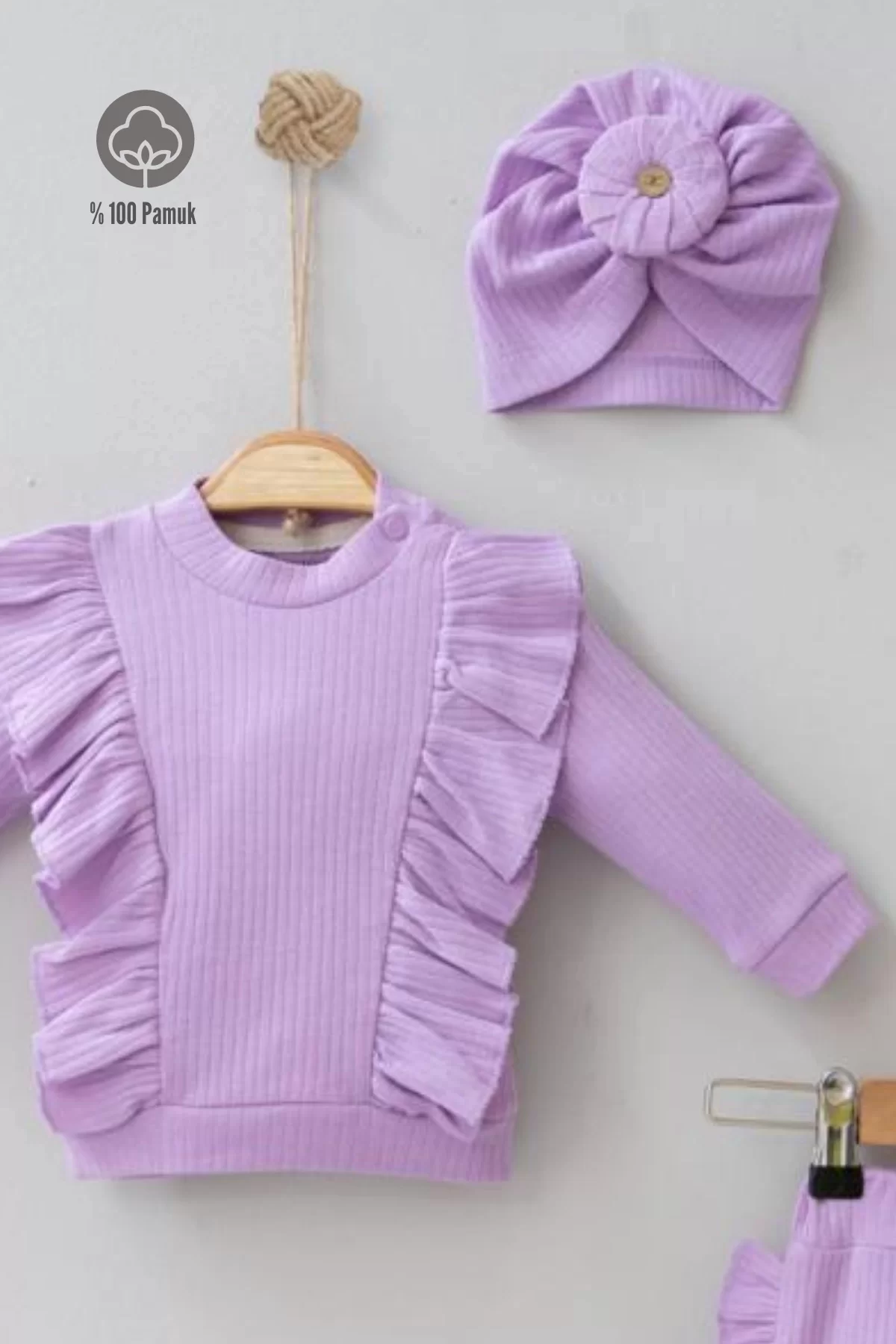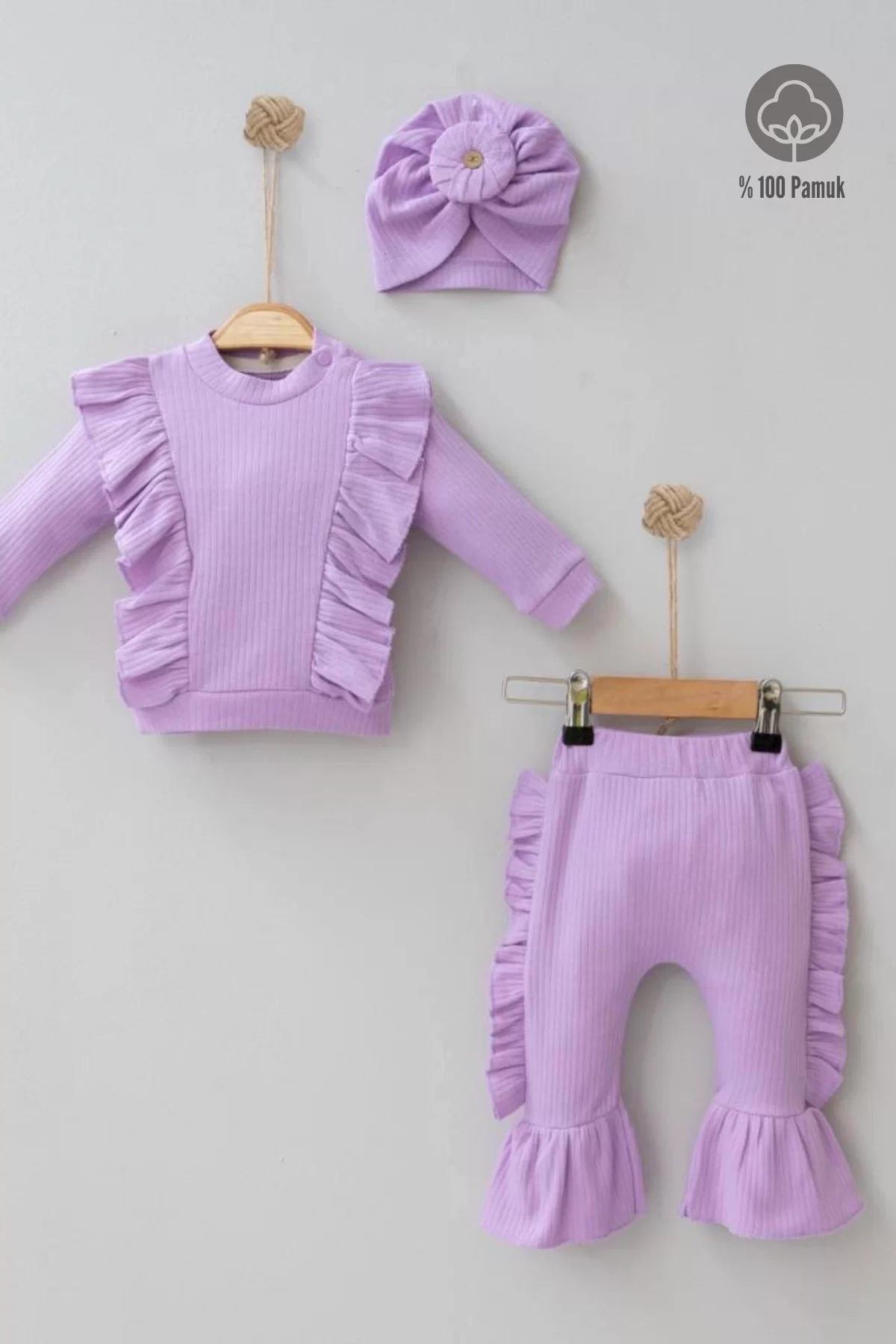 Omuzdan Fırfır Detaylı Boneli 3’lü % 100 Pamuklu Kız Bebek Takımı