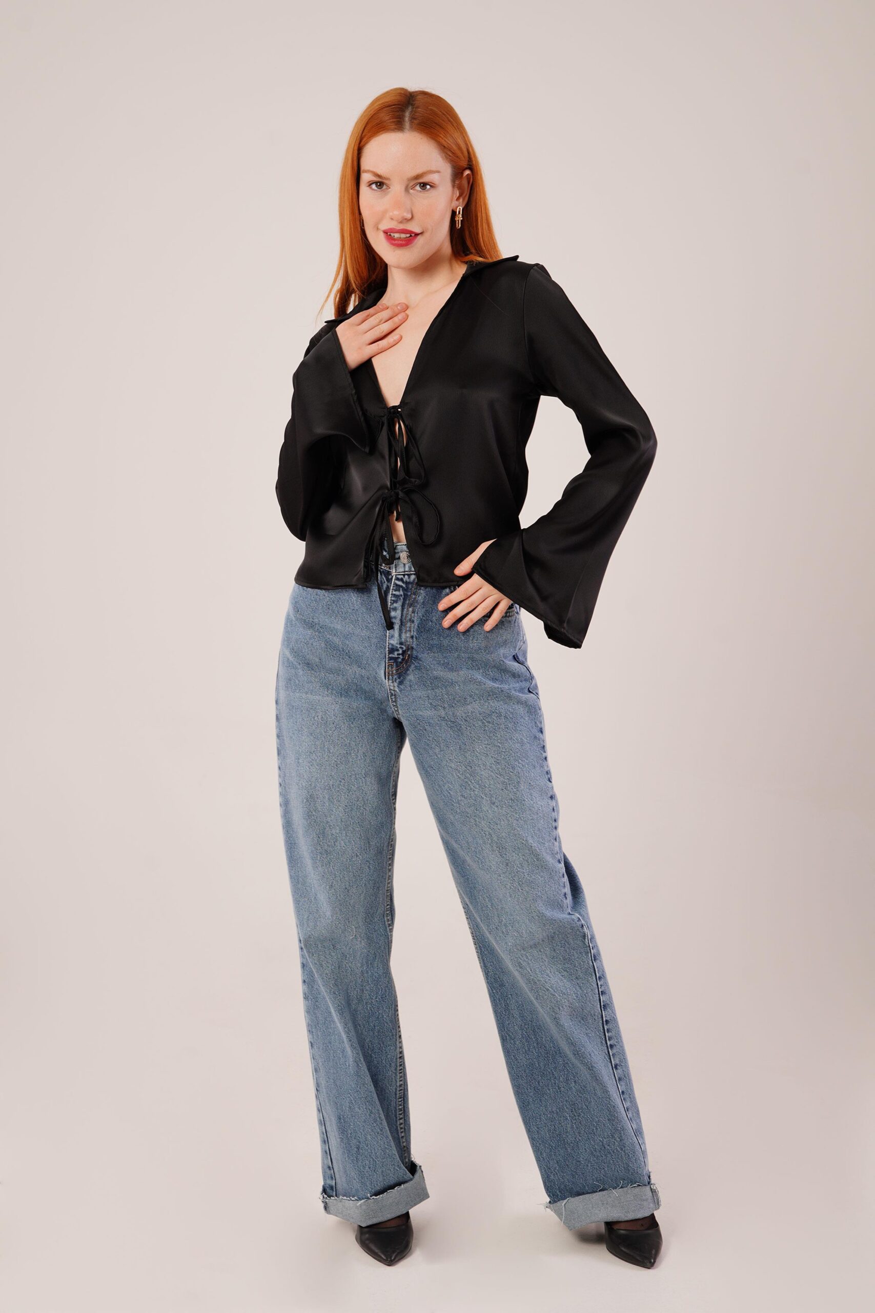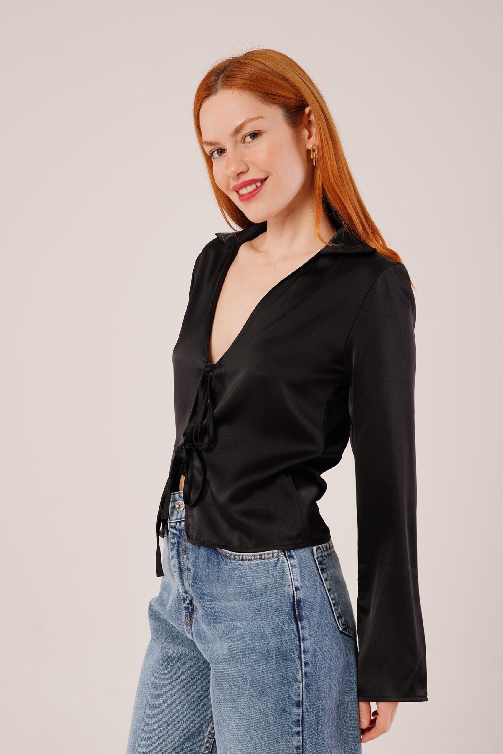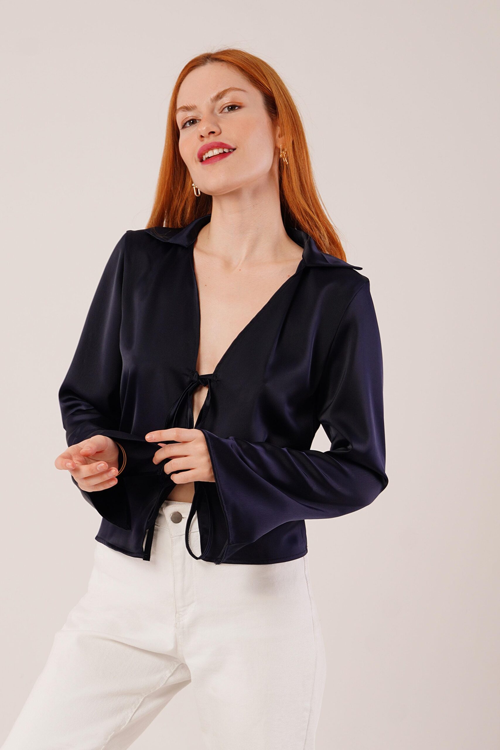 Önden Bağlama Detaylı Saten Lacivert Bluz