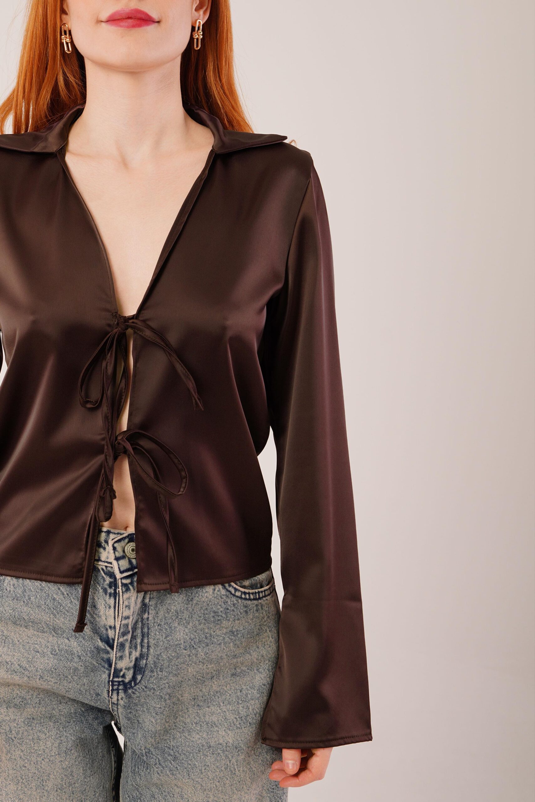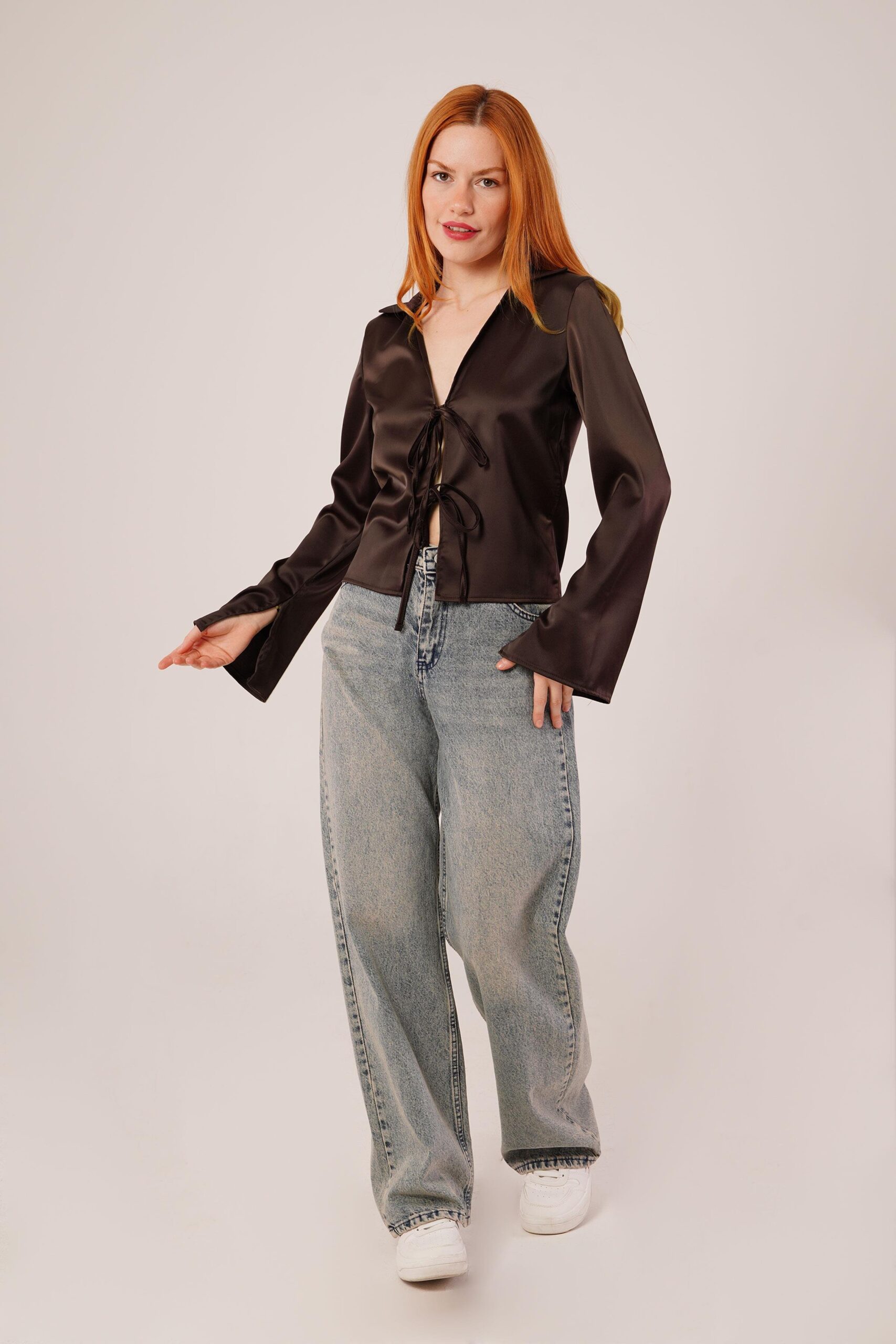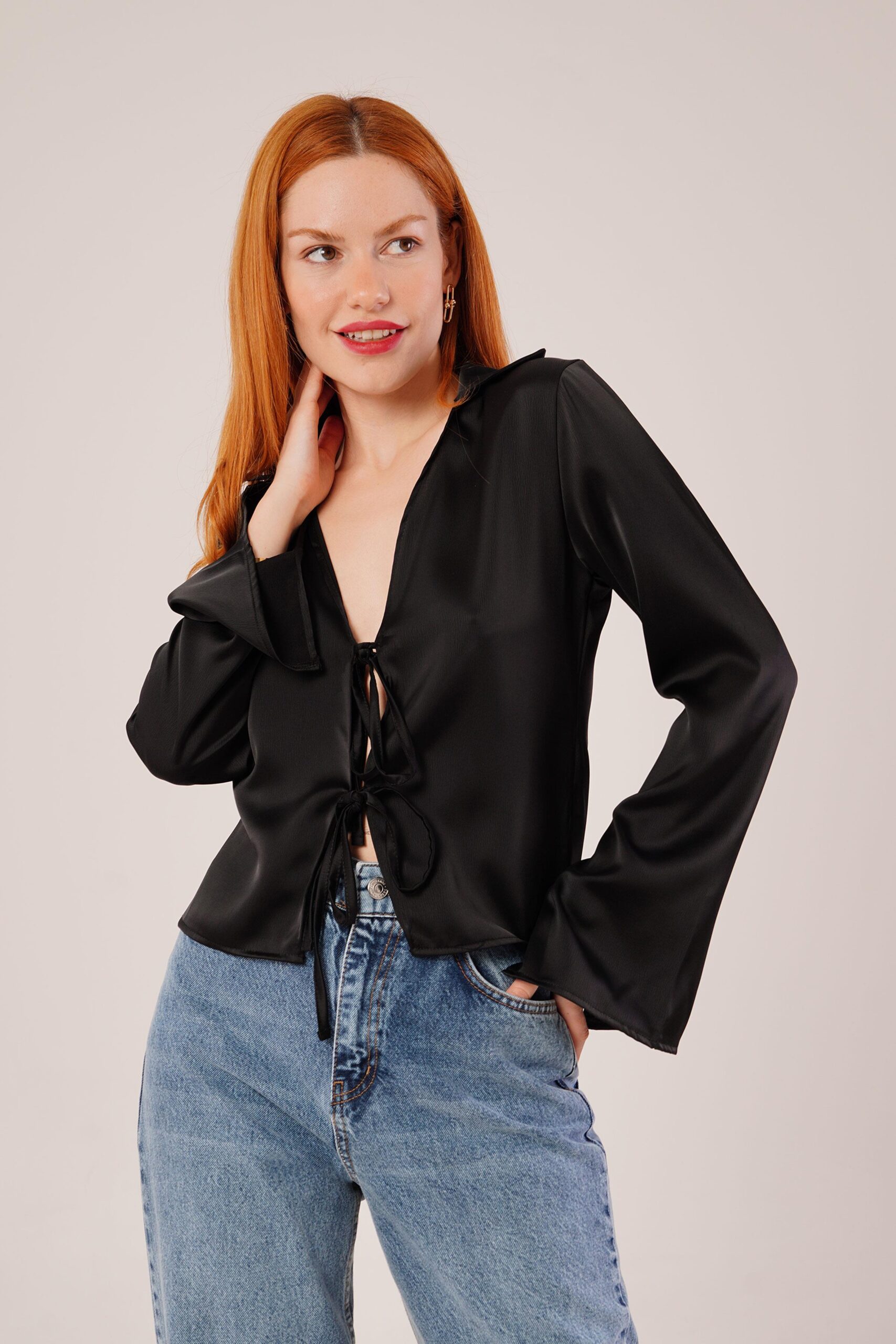 Önden Bağlama Detaylı Saten Lacivert Bluz