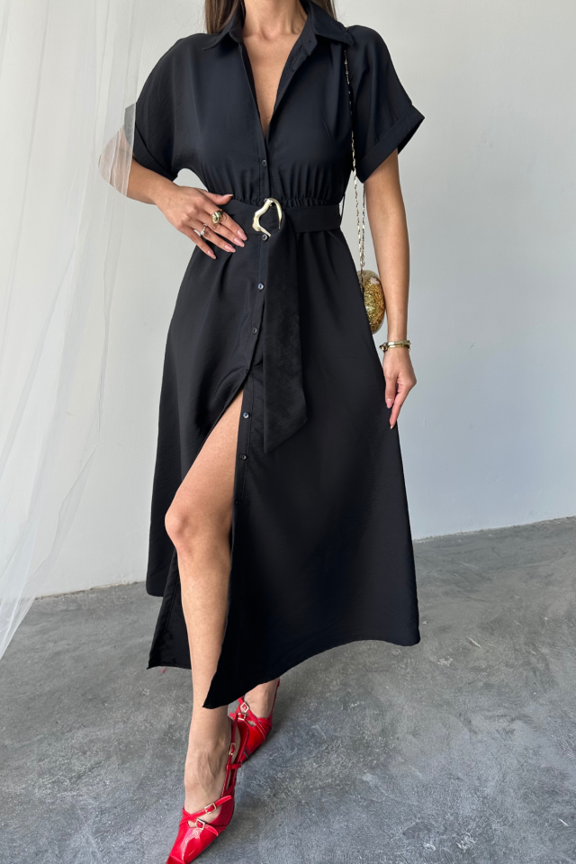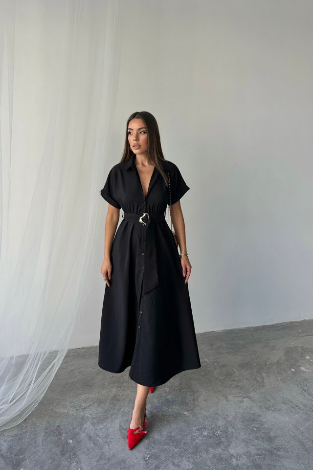ÖNDEN DÜĞMELİ CRUSHLI MODAL ELBİSE – Kahverengi