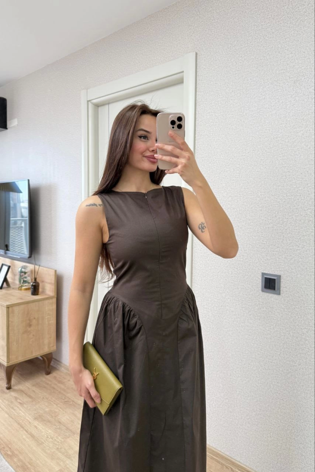 Önden Fermuar Detaylı Kolsuz Uzun Elbise – Kahve