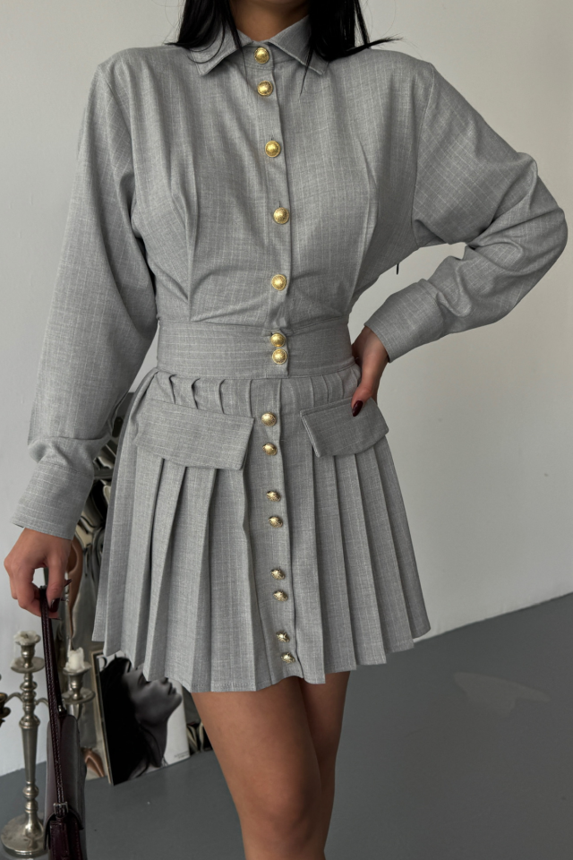 ÖNDEN GOLD DÜĞMELİ PİLELİ KISA ELBİSE – Gri