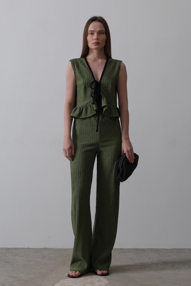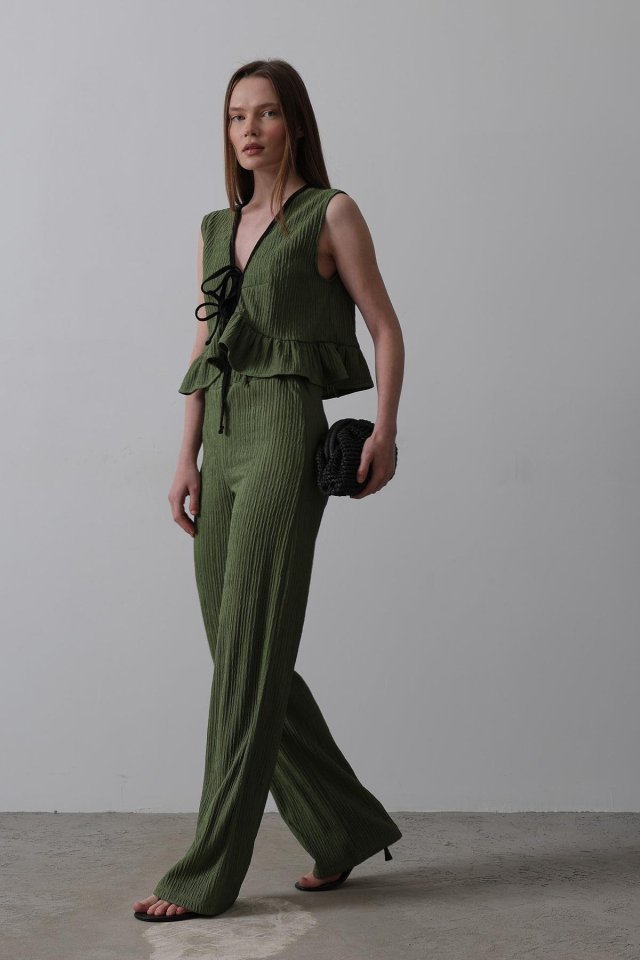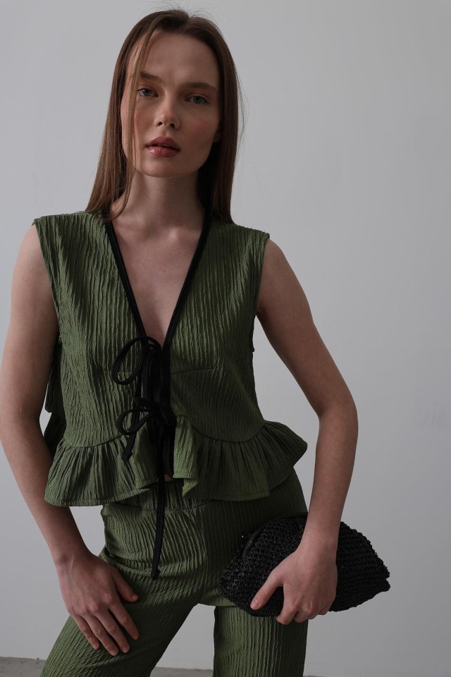 Önü Bağlamalı Volanlı Örme Takım – Haki
