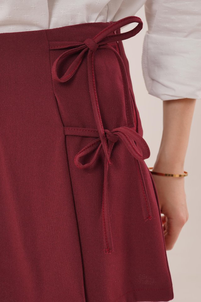 Önü Piliseli Yandan Bağlama Detaylı Bordo Mini Şort Etek