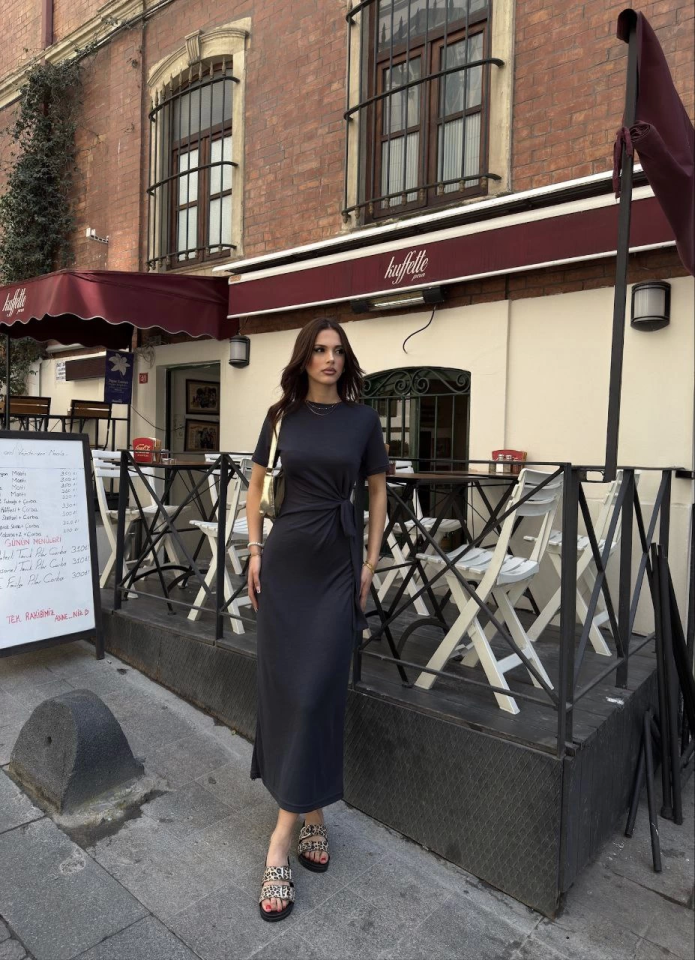 Osy Modal Yumuşak Dokulu Kumaş Bisiklet Yaka Kısa Kollu Kuşaklı Uzun Elbise – Füme