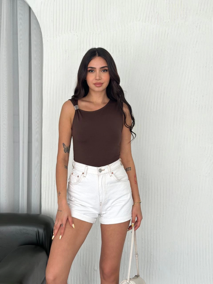 Osy Modal Yumuşak Dokulu Kumaş Bisiklet Yaka Sıfır Kol Bluz Omuz Toka Aksesuar Detaylı – Kahverengi