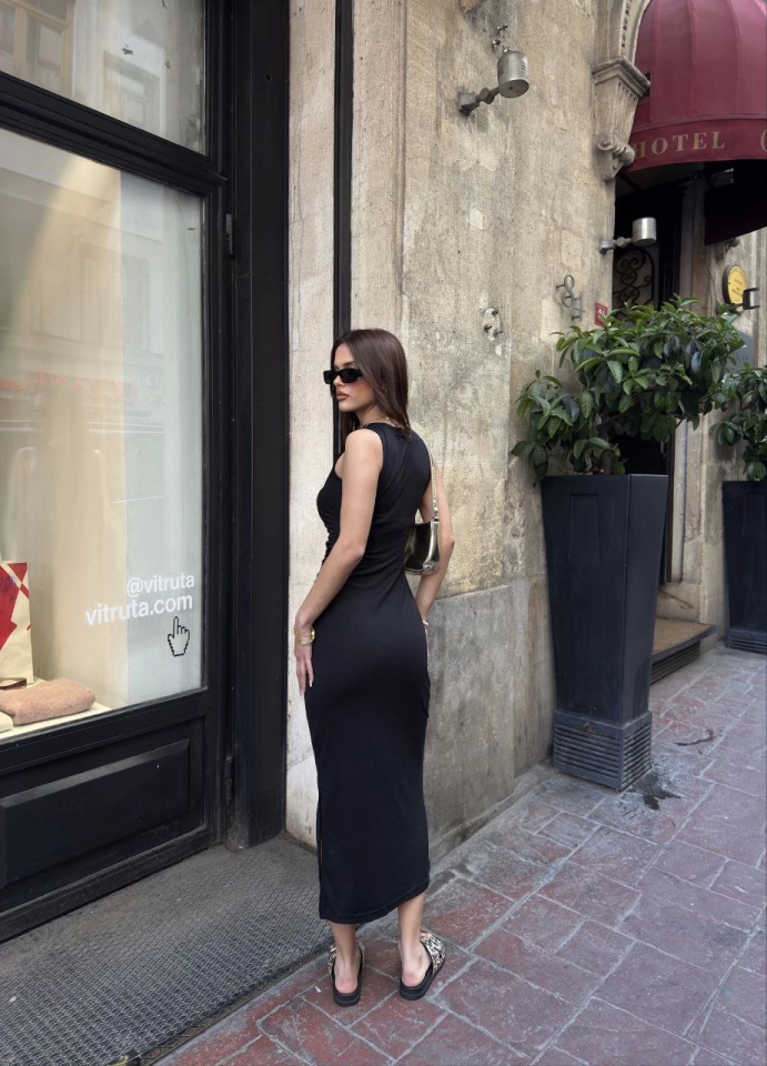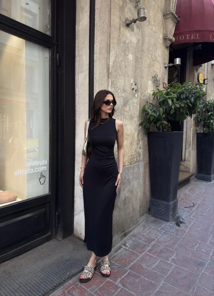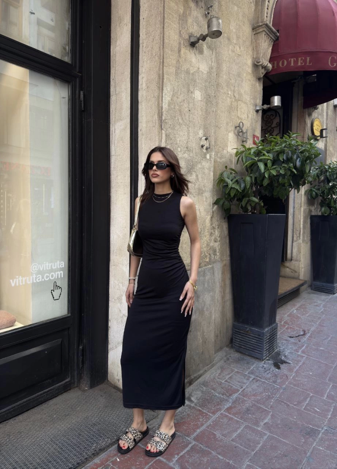 Osy Modal Yumuşak Dokulu Kumaş Bisiklet Yaka Sıfır Kolsuz Yırtmaçlı Uzun Elbise – Siyah