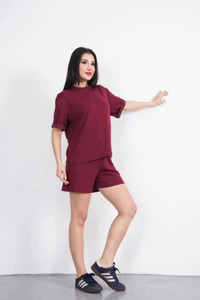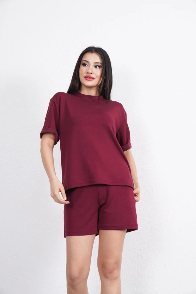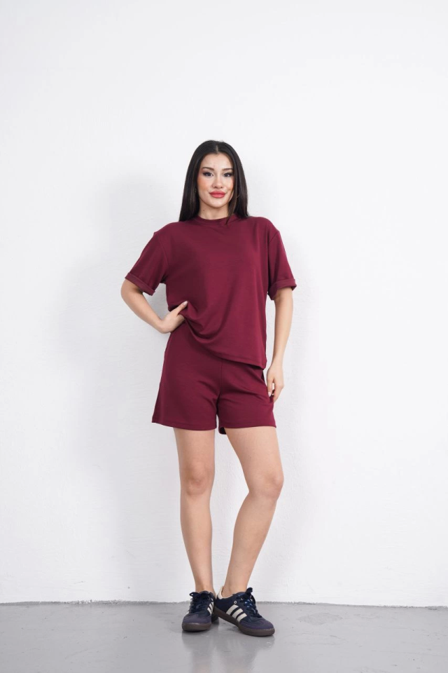 Osy Modal Yumuşak Dokulu Kumaş Bisiklet Yaka T-shirt Kısa Şort İkili Takım – Bordo