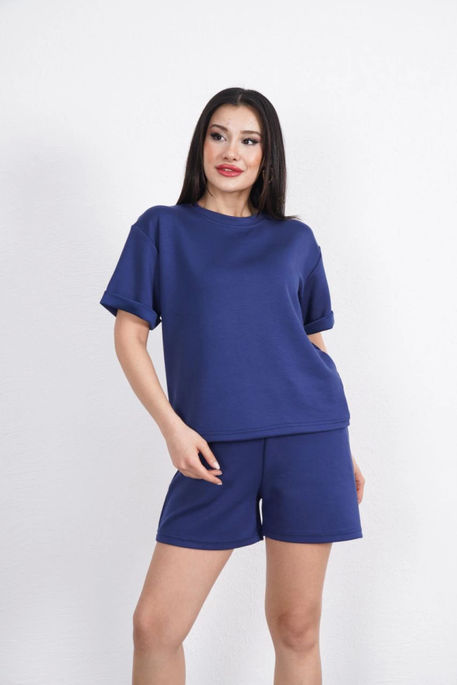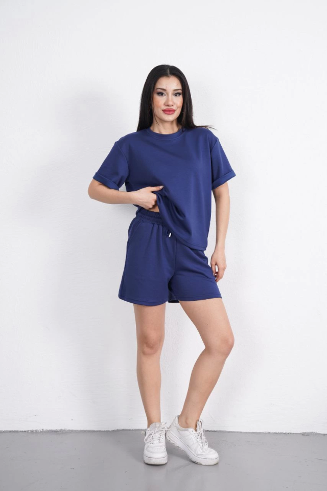 Osy Modal Yumuşak Dokulu Kumaş Bisiklet Yaka T-shirt Kısa Şort İkili Takım – Mavi