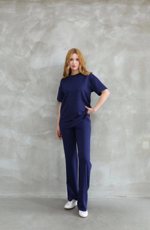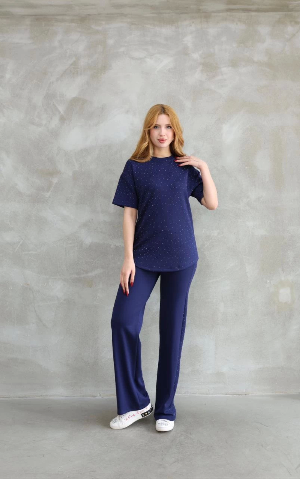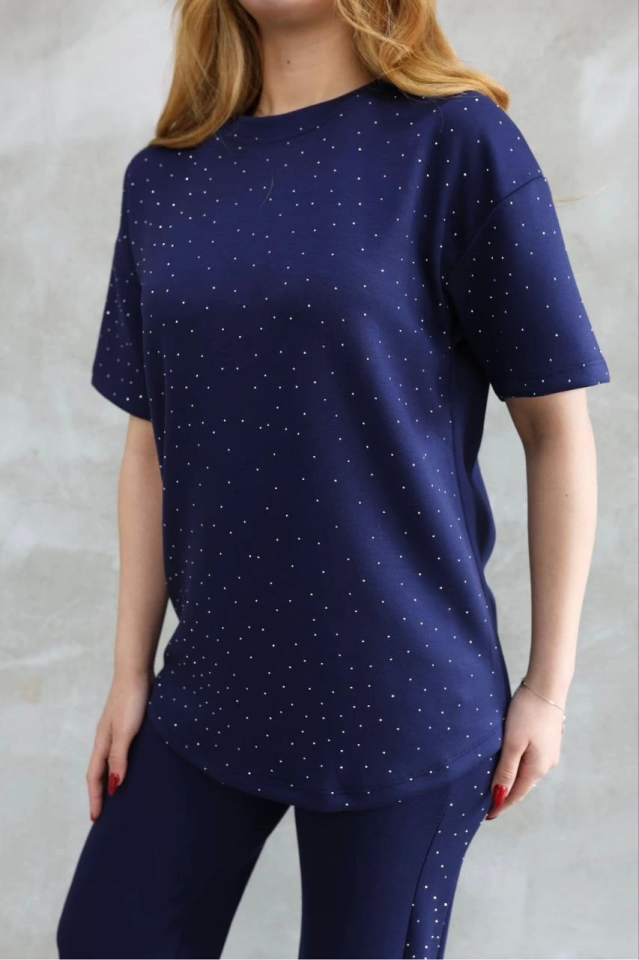 Osy Modal Yumuşak Dokulu Kumaş Bisiklet Yaka Taş Detaylı Kısa Kollu Takım – Lacivert