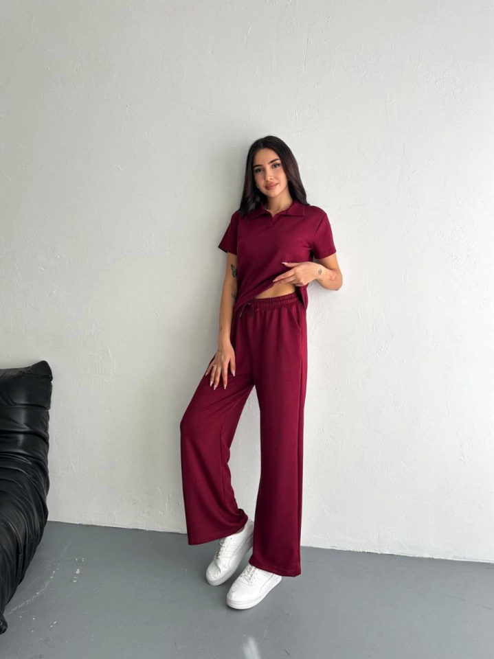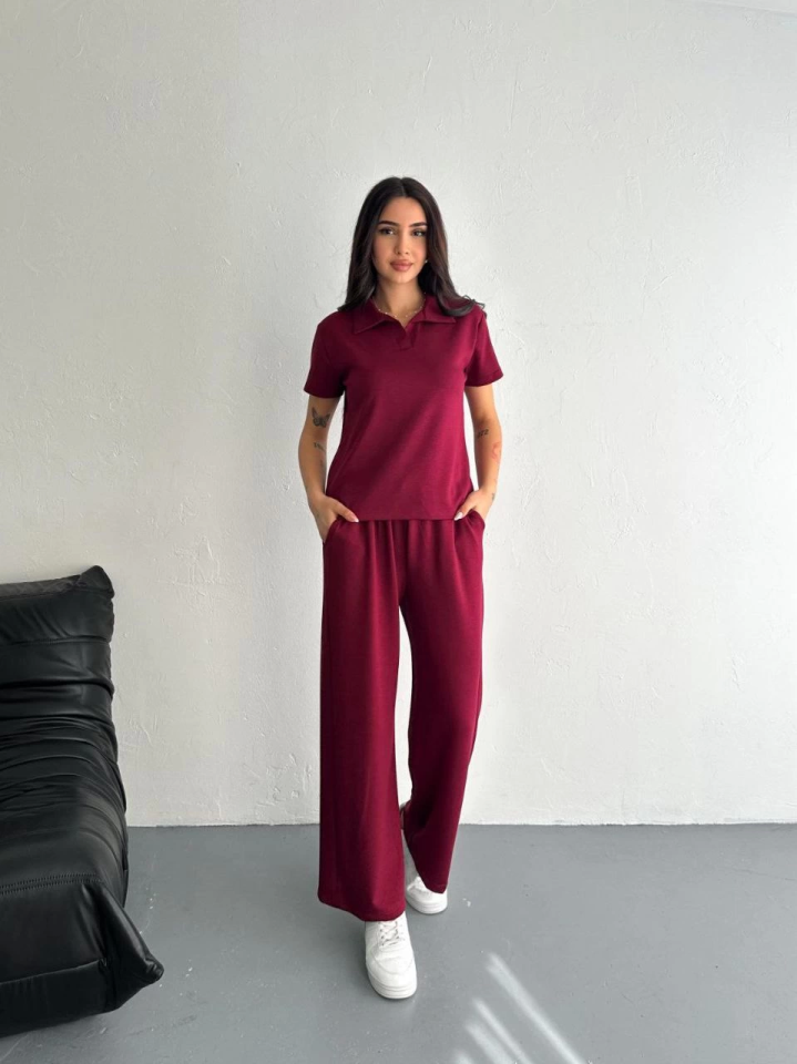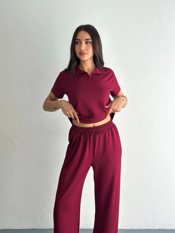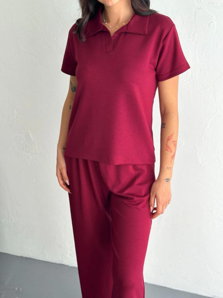 Osy Modal Yumuşak Dokulu Kumaş Kısa Kollu Yakalı T-shirt Pantalon Ikili Takım- Bordo