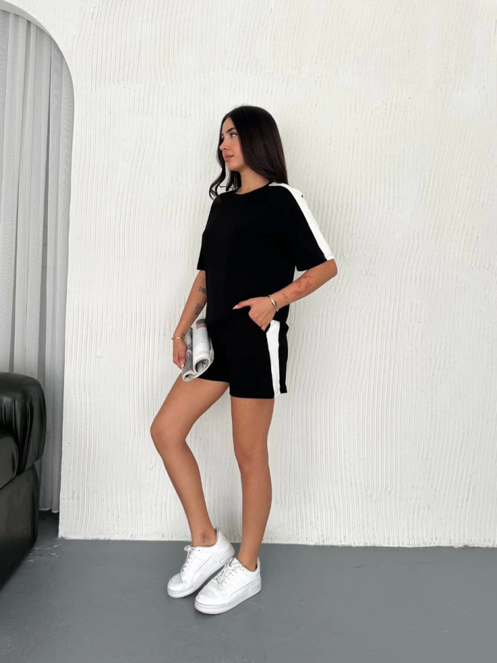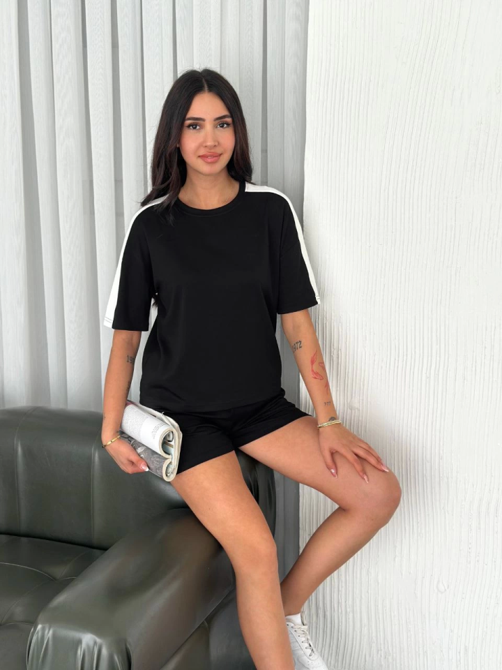 Osy Modal Yumuşak Dokulu Kumaş Parçalı Bisiklet Yaka T-shirt Kısa Şort İkili Takım – Siyah