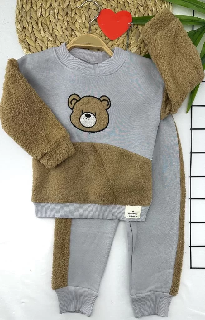 Parça Welsoftlu Ayı Nakışlı Uzun Kollu 2li Kız Erkek Çocuk Takımı Gri adet