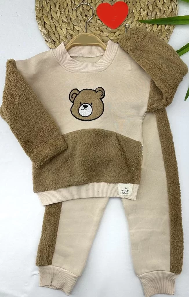/ Parça Welsoftlu Ayı Nakışlı Uzun Kollu 2li Kız Erkek Çocuk Takımı Krem