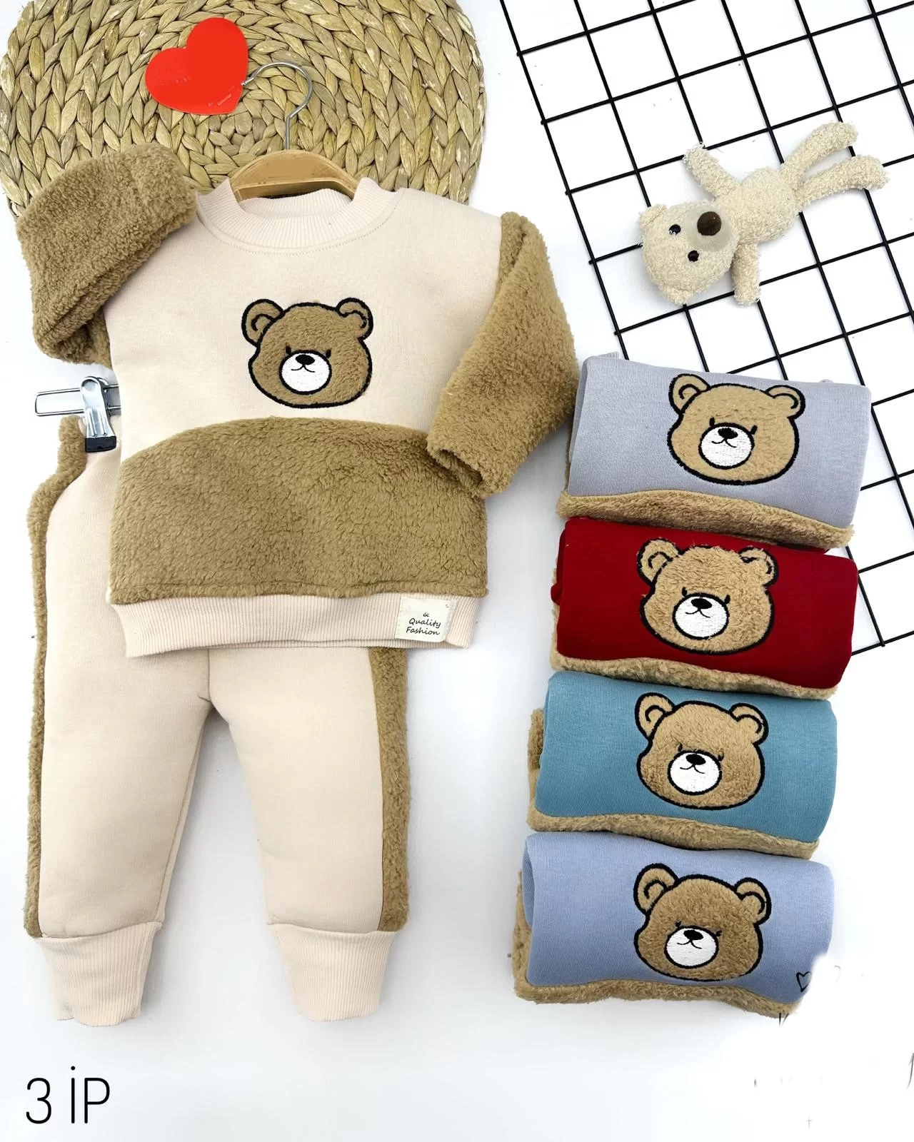 Parça Welsoftlu Ayı Nakışlı Uzun Kollu 2li Kız Erkek Çocuk Takımı Krem adet