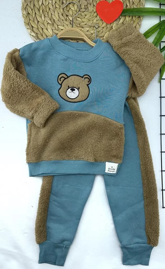/ Parça Welsoftlu Ayı Nakışlı Uzun Kollu 2li Kız Erkek Çocuk Takımı Su Yeşili