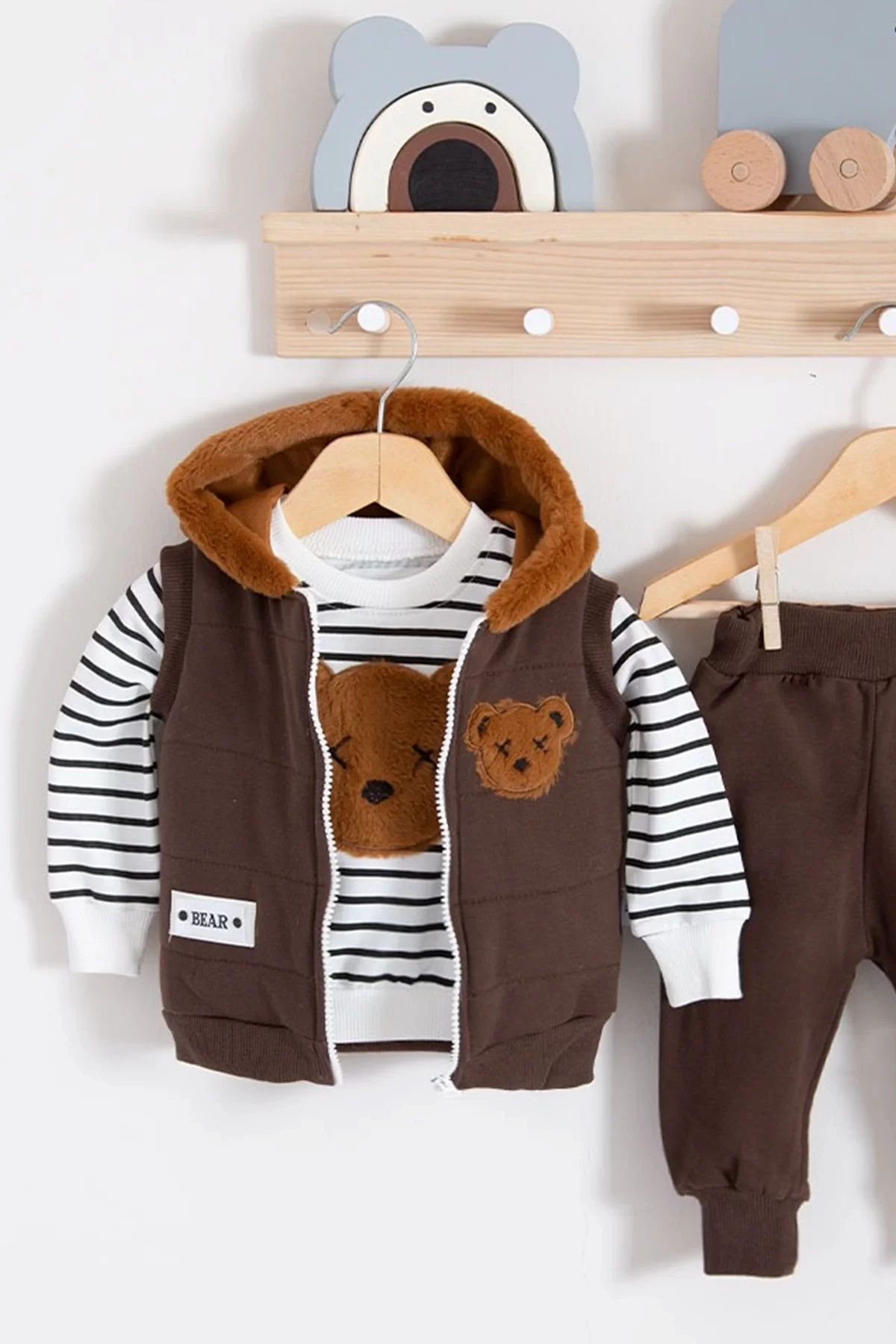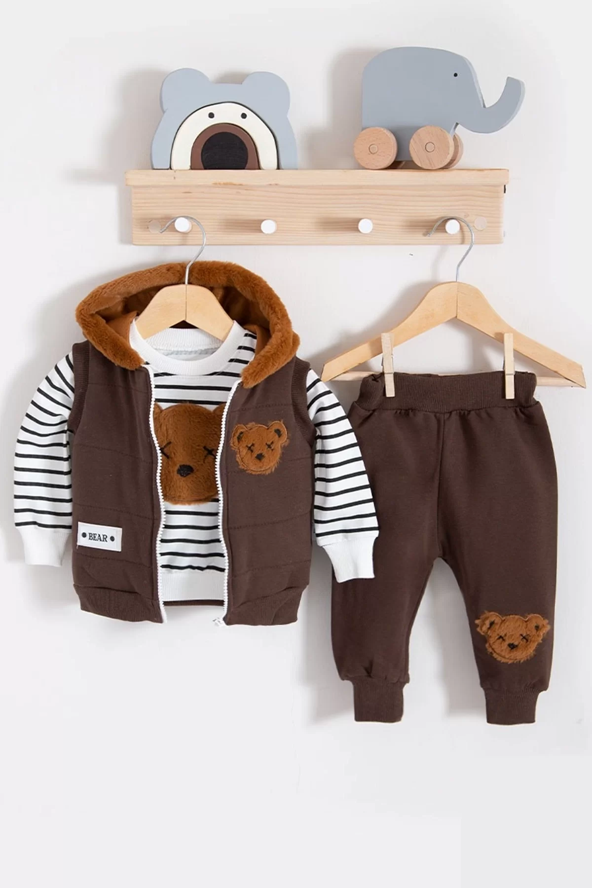 Peluş Ayıcık Desenli Kapişonlu 3’lü Erkek Bebek Takımı.
