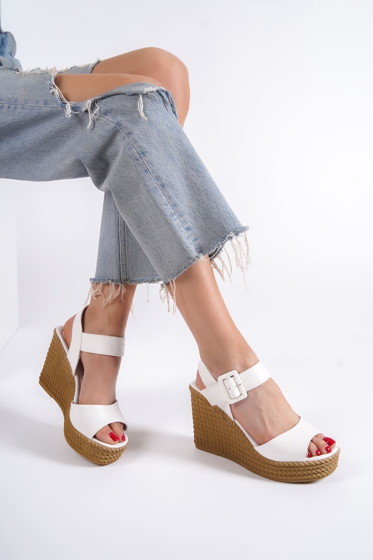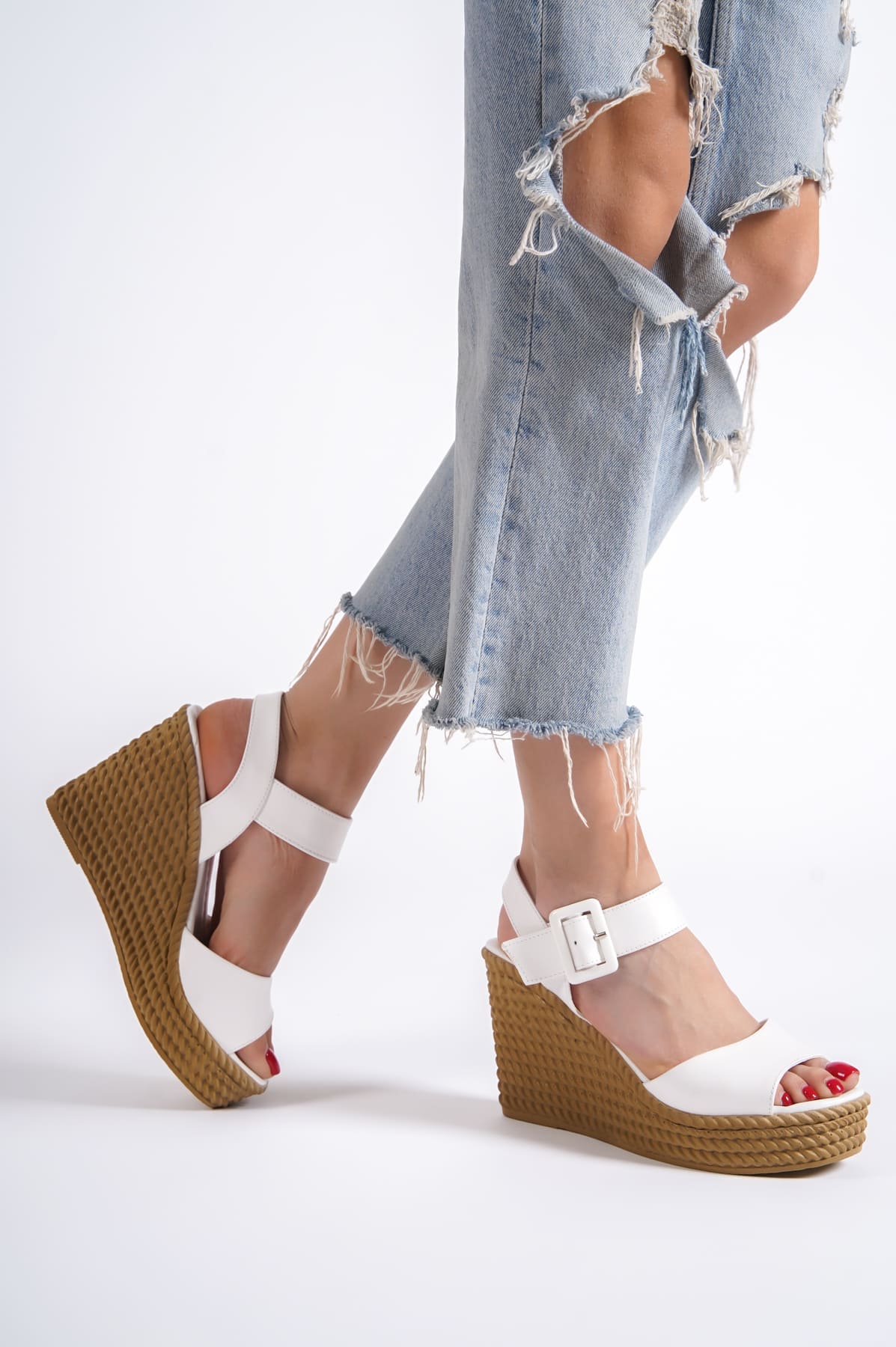 PERLA Tokalı Lastikli Dolgu Topuklu Ortopedik Taban Hasır Görünümlü Kadın Sandalet CKT – Beyaz