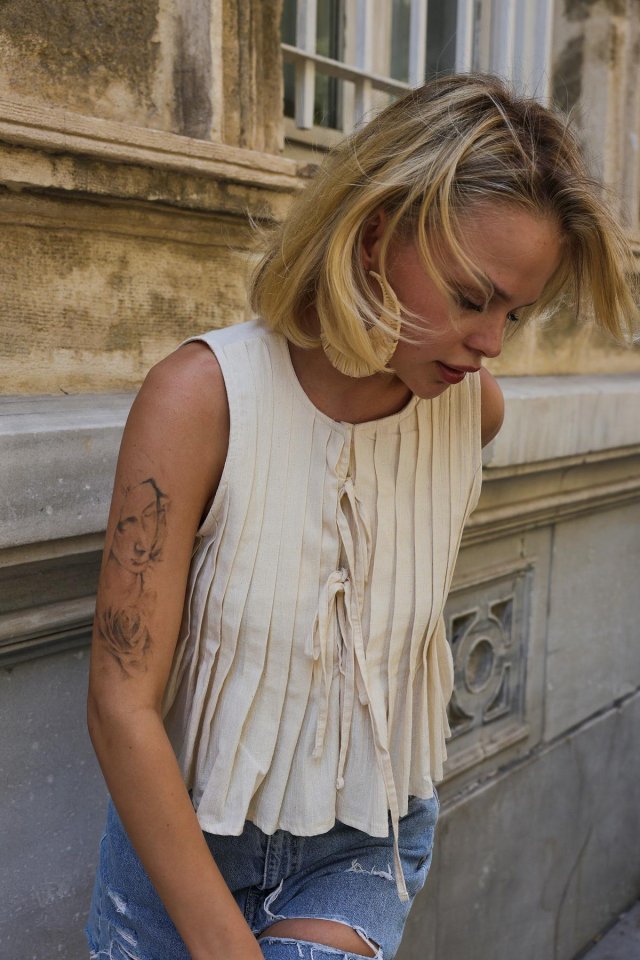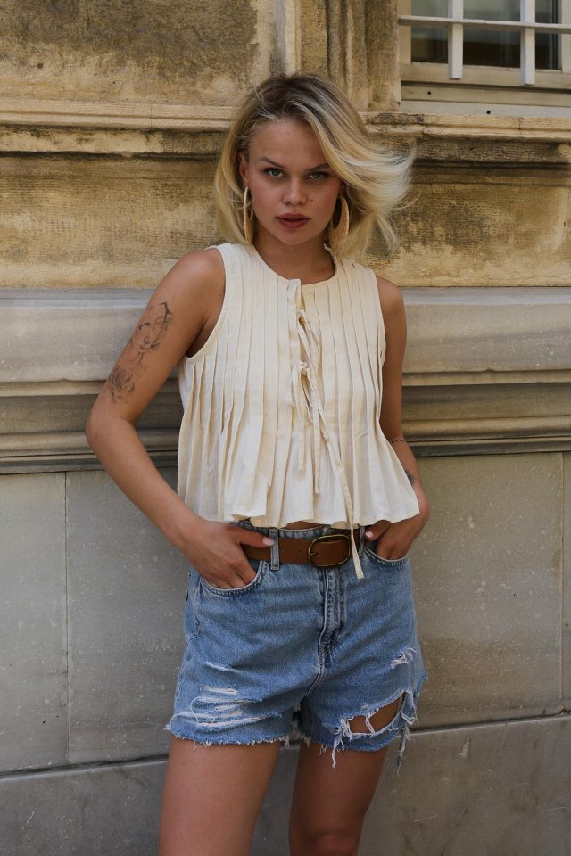 Pileli Bağlamlı Bluz – Natür