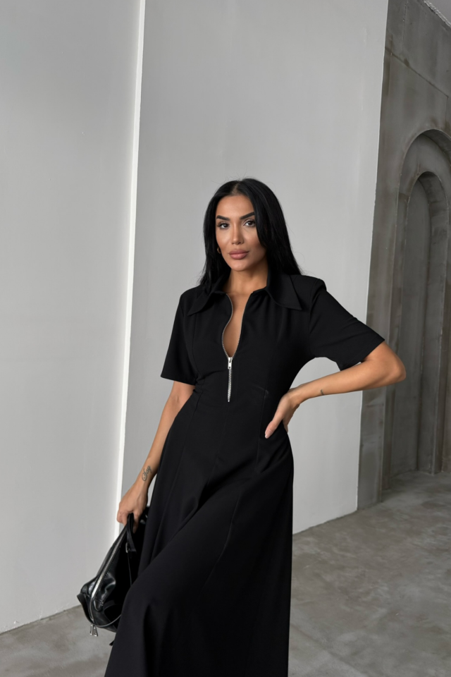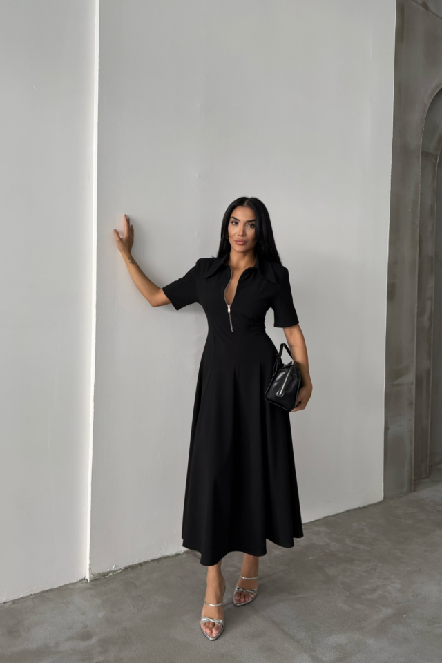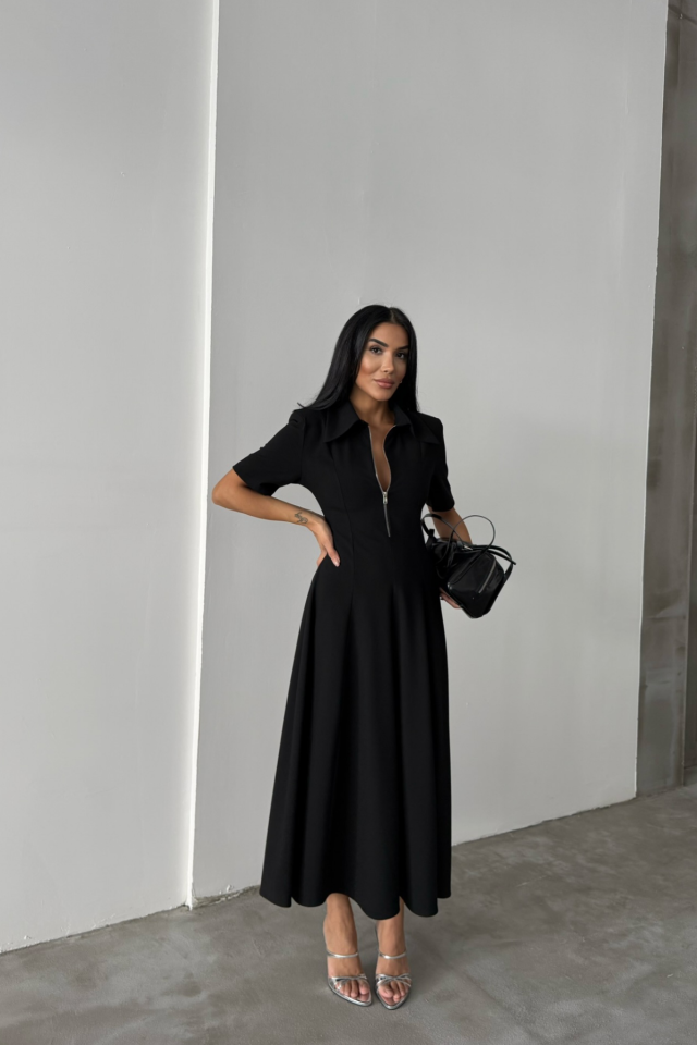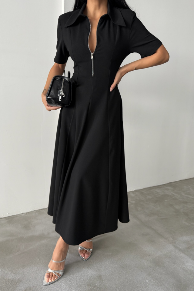POLYVİSKON ELBİSE KISA KOL YAKA VE FERMUAR DETAYLI – Siyah