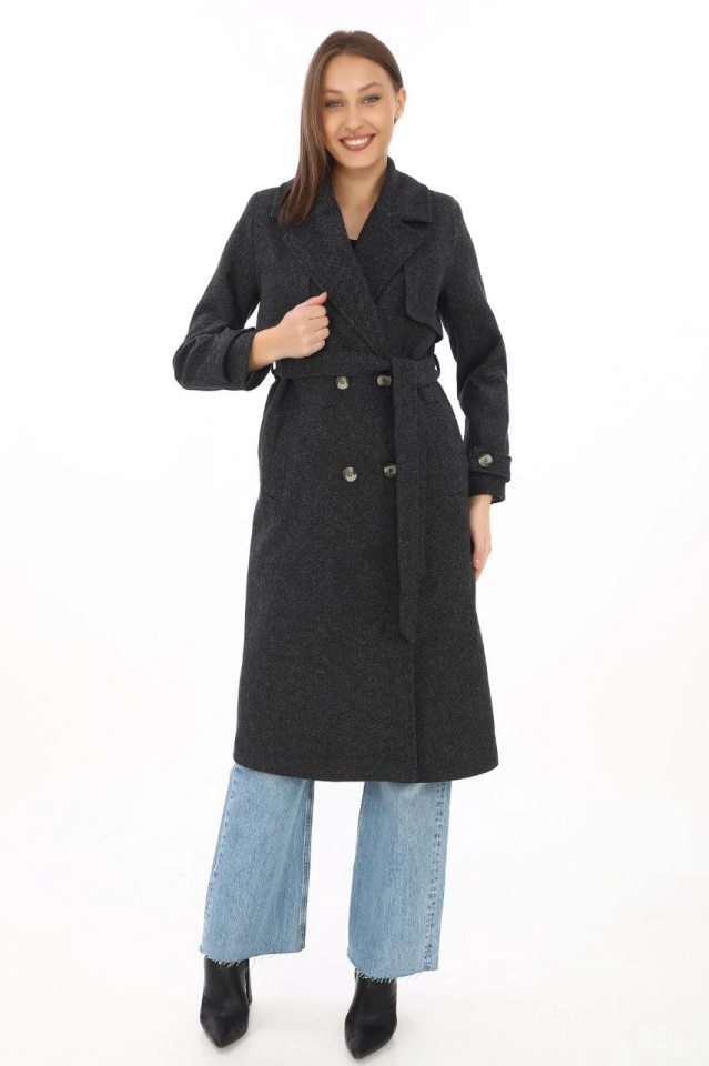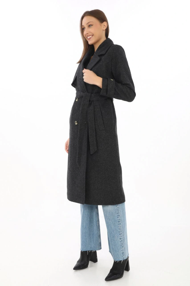 Premium Kaşe Kaban Uzun Boy, Balık Sırtı Yünlü Kaşmir Dokuma, Kruvaze Kuşaklı Astarlı – Siyah