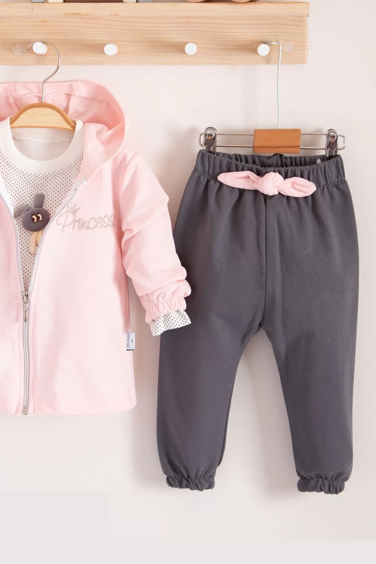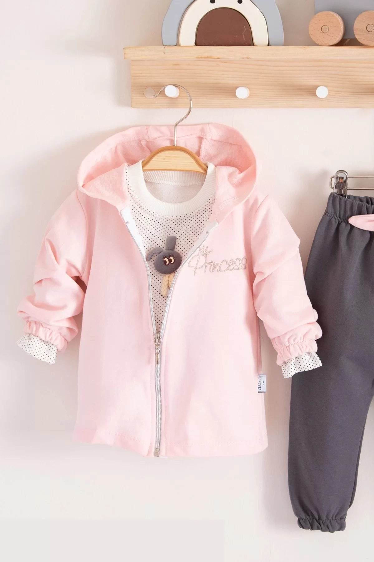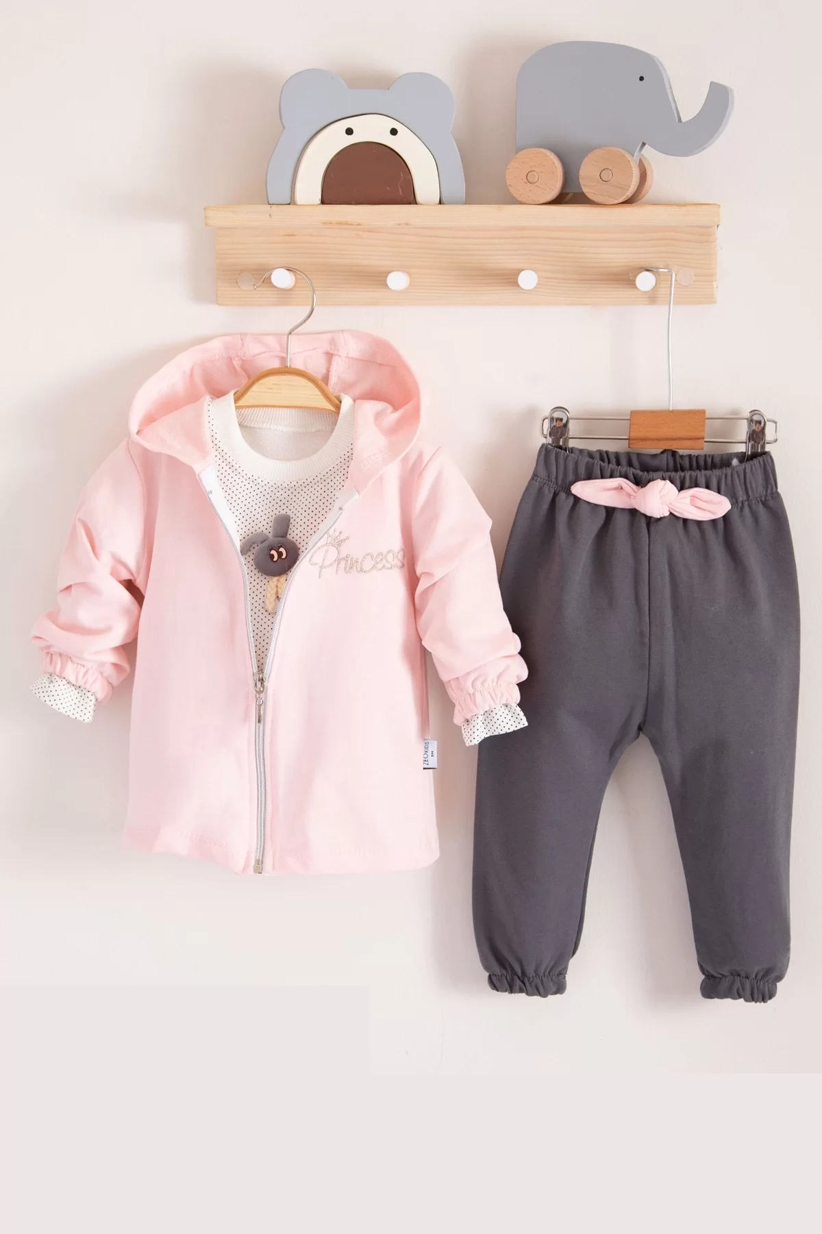 Prences Nakışlı Kapişonlu 3’lü % 100 Pamuk Kız Bebek Takımı