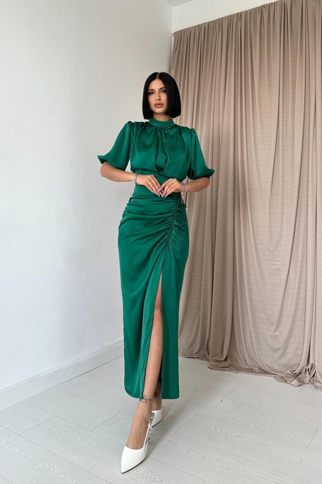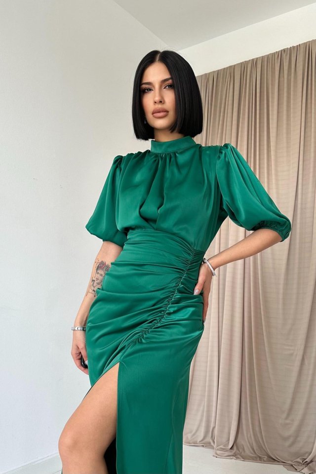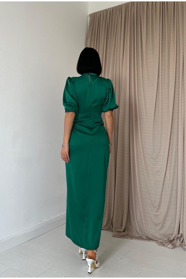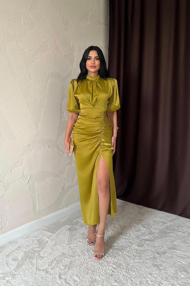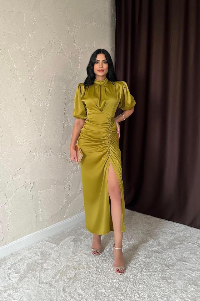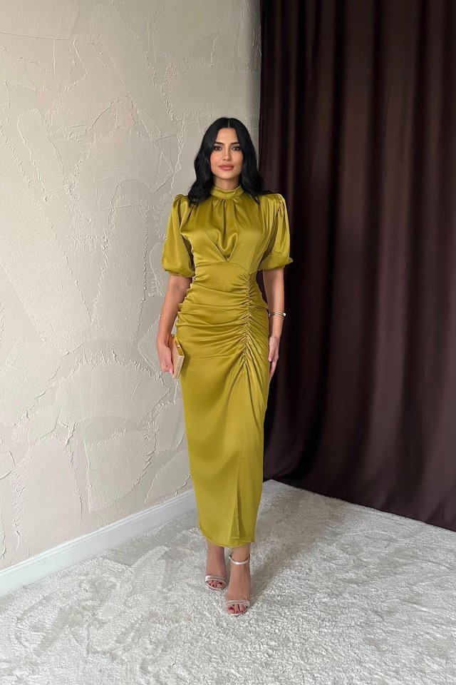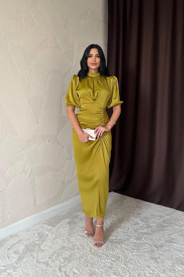 “Yağ Yeşili Büzgülü Saten Elbise” için yorum yapan ilk kişi siz olun